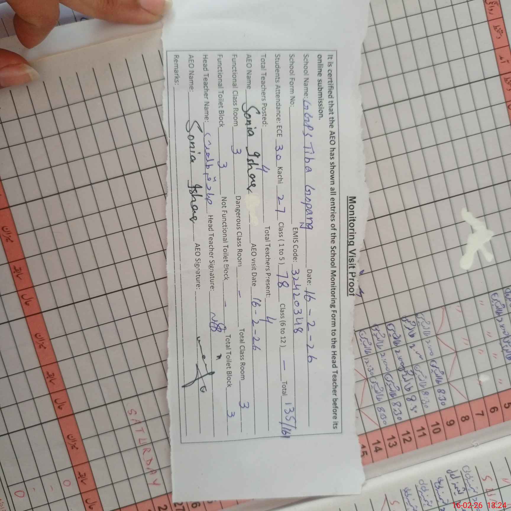 | Attendance Register | Head Teacher | MEA with School | Visit Proof |