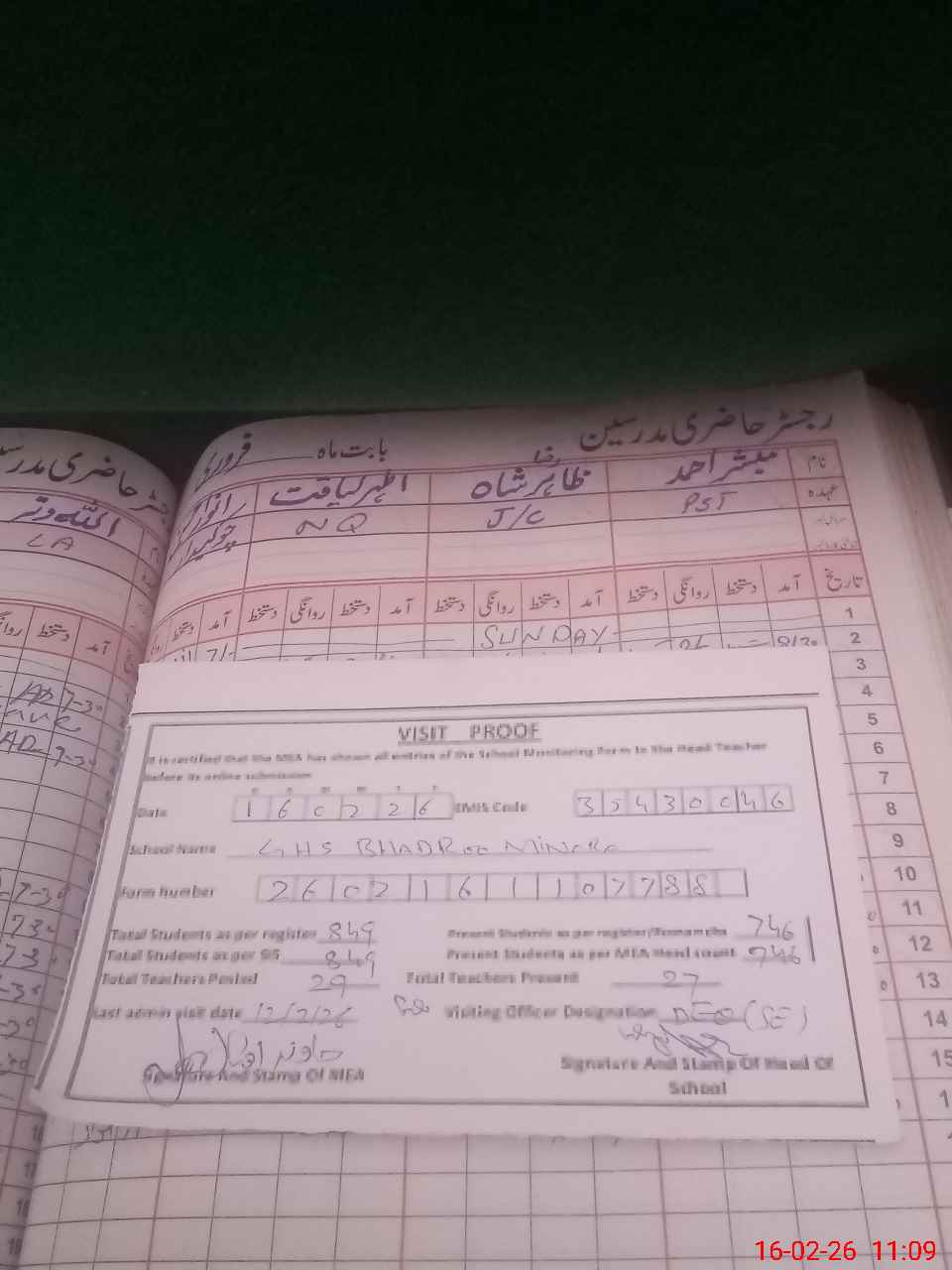 | Attendance Register | Head Teacher | MEA with School | Visit Proof |
