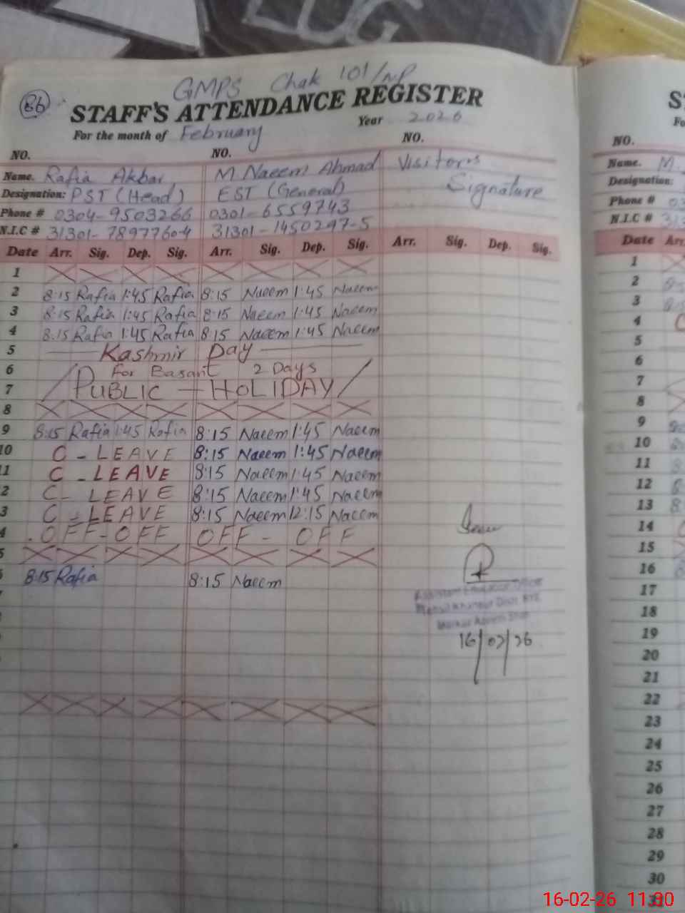 | CNIC | Full Name | Designation | R/C | Absence During Last Calender Month |