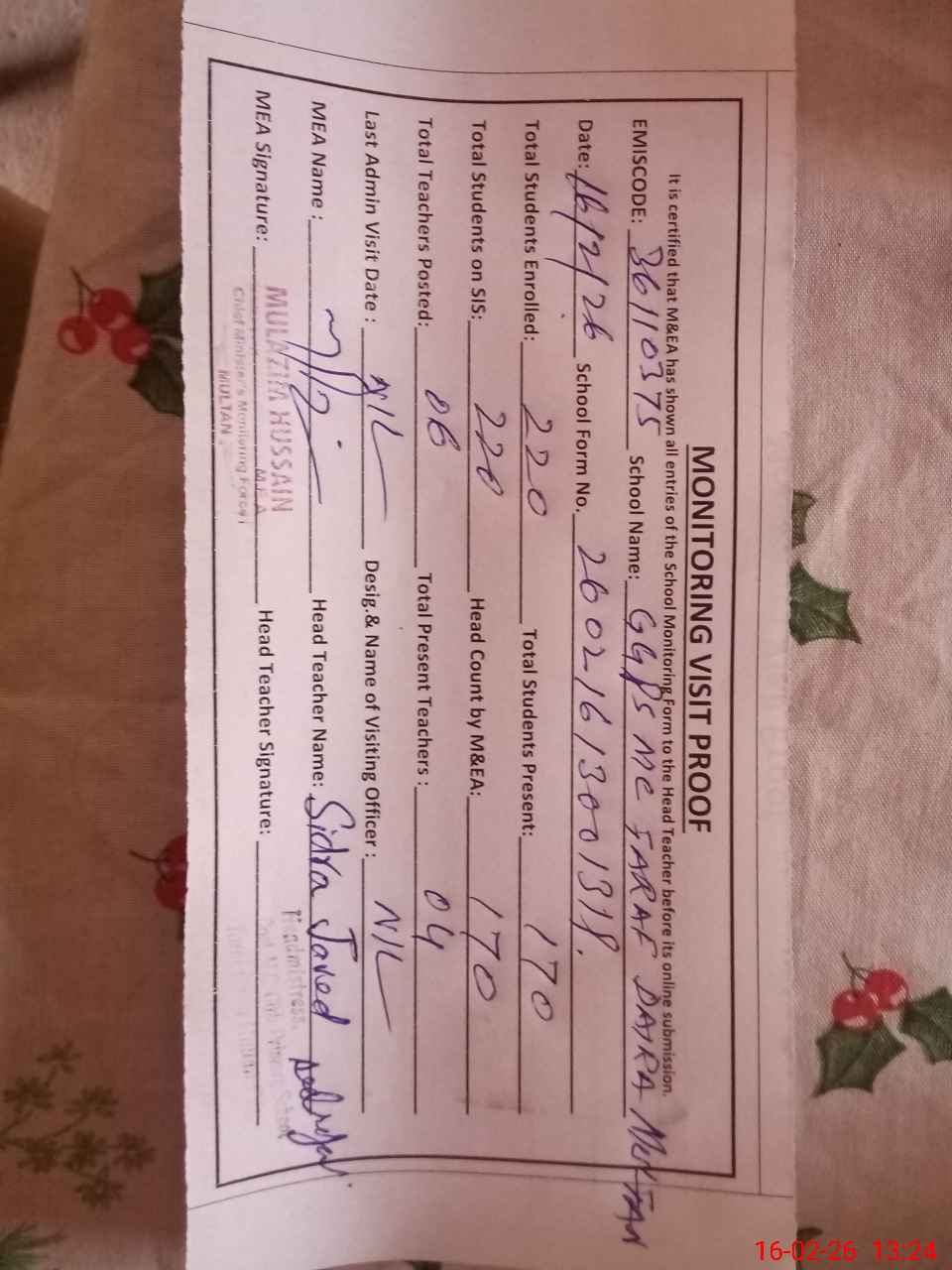 | Certified that this School was Inspected by the Undersigned MEA/DMO Today and the Information Stated Above is as Per Record. | |||||
