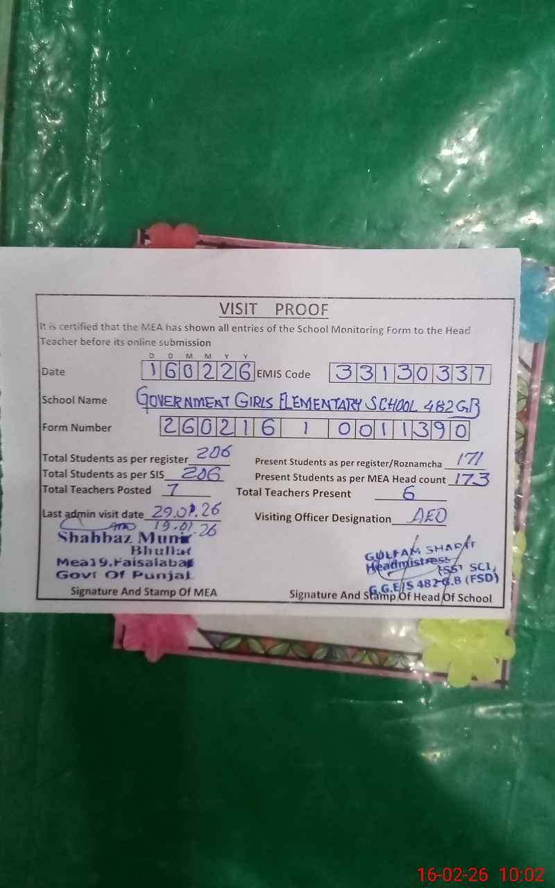| EMIS Code: 33130337 | Name of School: GGES CHAK NO.482/GB | |||
