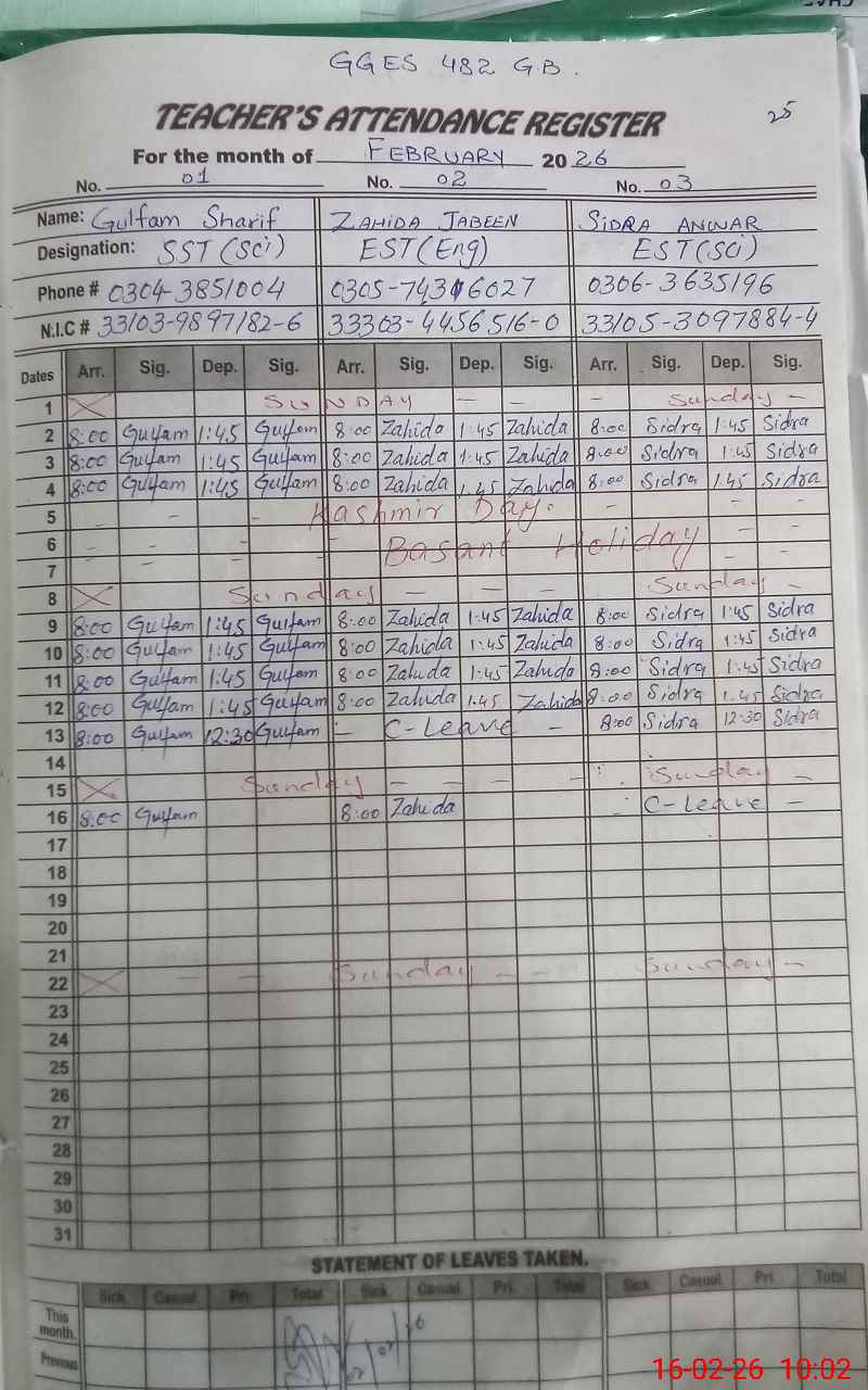 | Name: GU**** SH**** Designation: (School Headmaster's/Headmistress's) SST SCIENCE Phone/Cell Number: 03**** |
