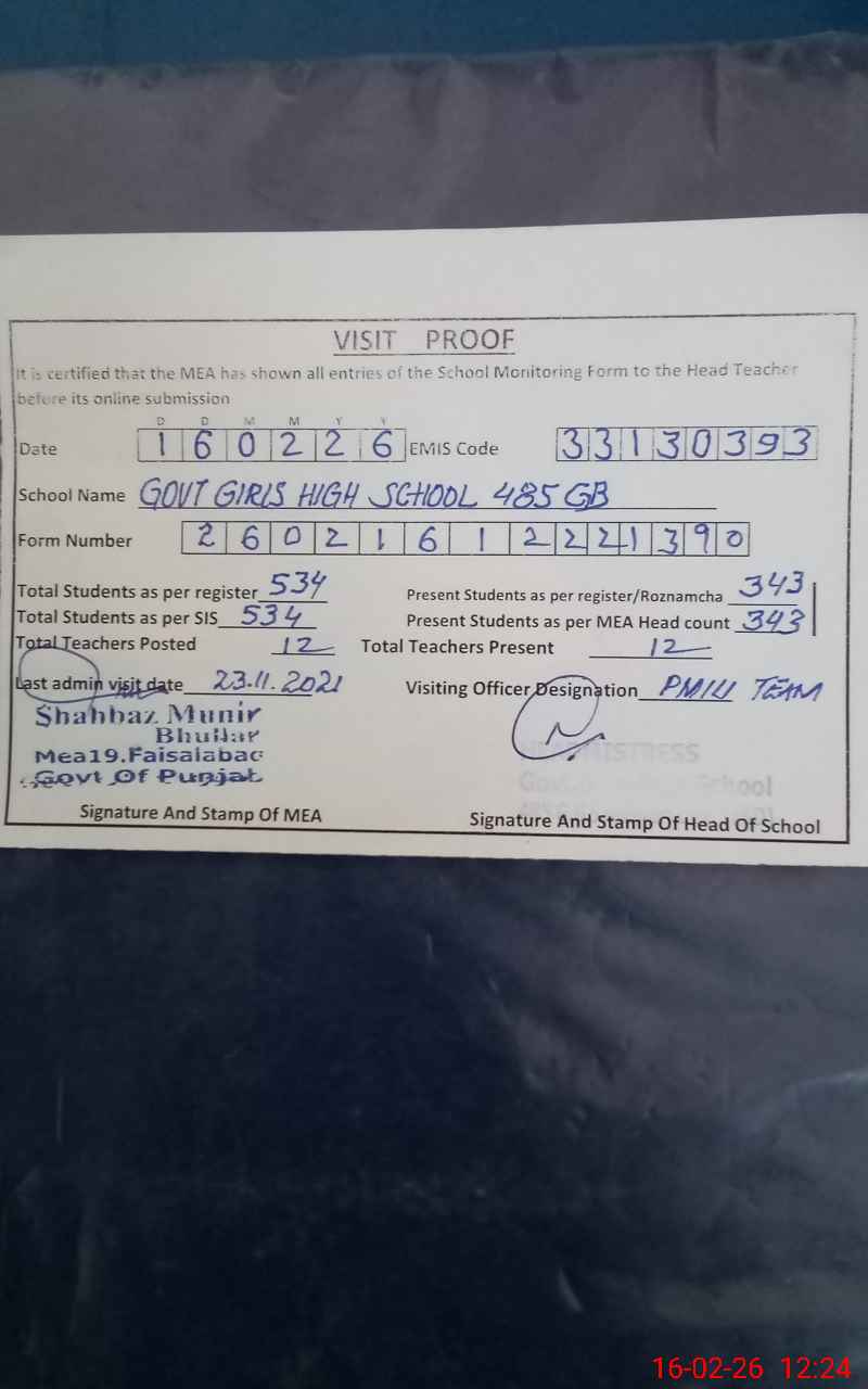 | EMIS Code: 33130393 | Name of School: GGHS CHAK NO 485 GB FSD | |||