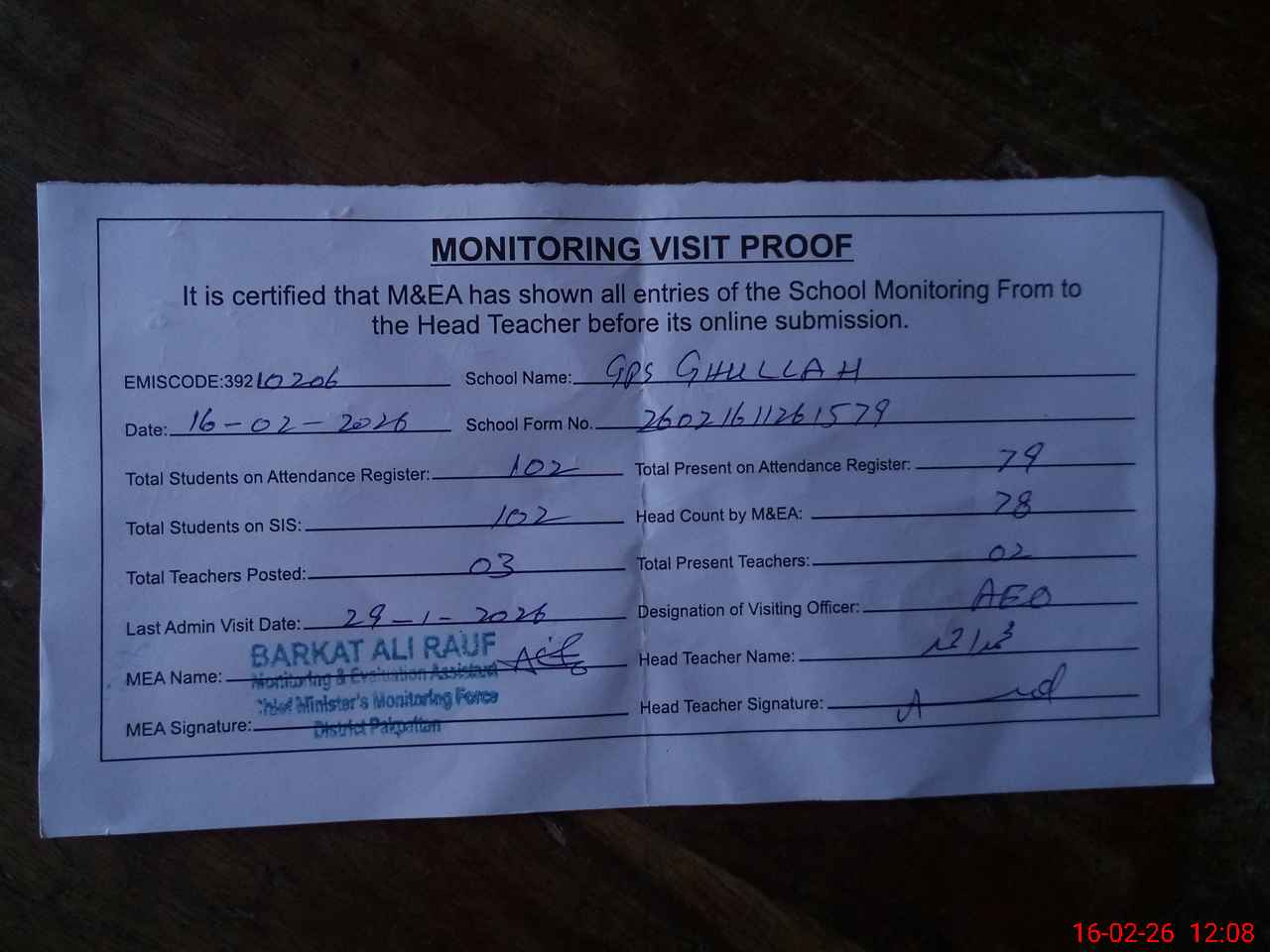 | EMIS Code: 39210206 | Name of School: GPS GHULLA P/O PAKPATTAN | |||