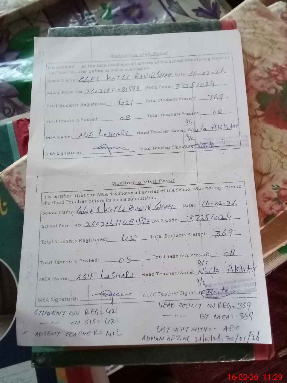 | Attendance Register | Head Teacher | MEA with School | Visit Proof |
