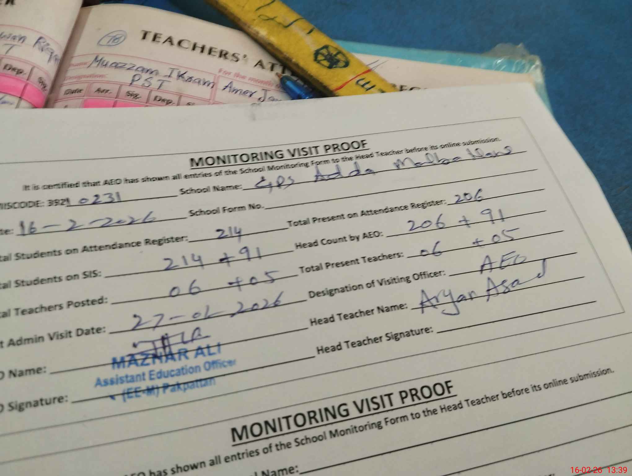| Attendance Register | Head Teacher | MEA with School | Visit Proof |