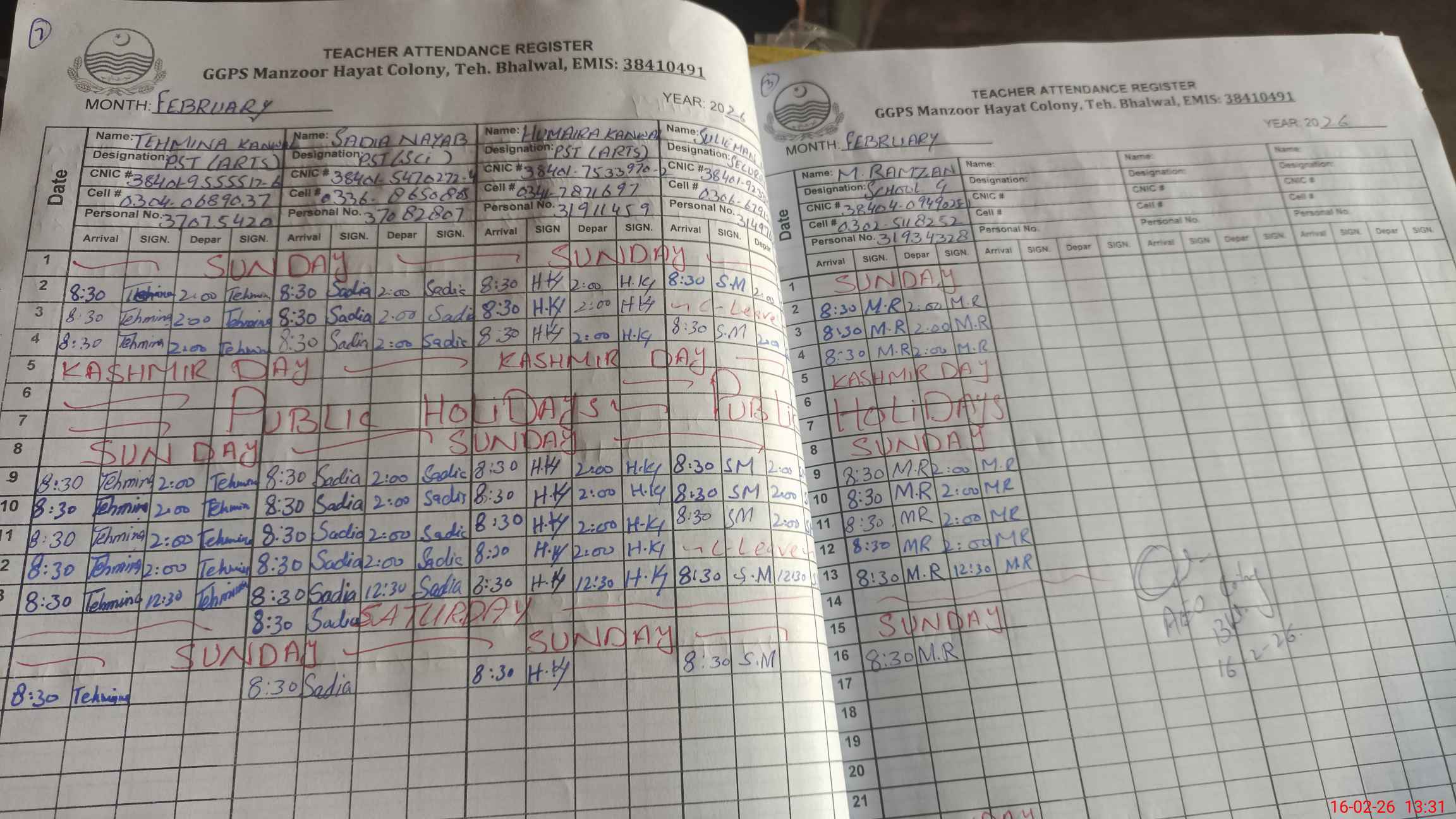 | CNIC | Full Name | Designation | R/C | Absence During Last Calender Month |