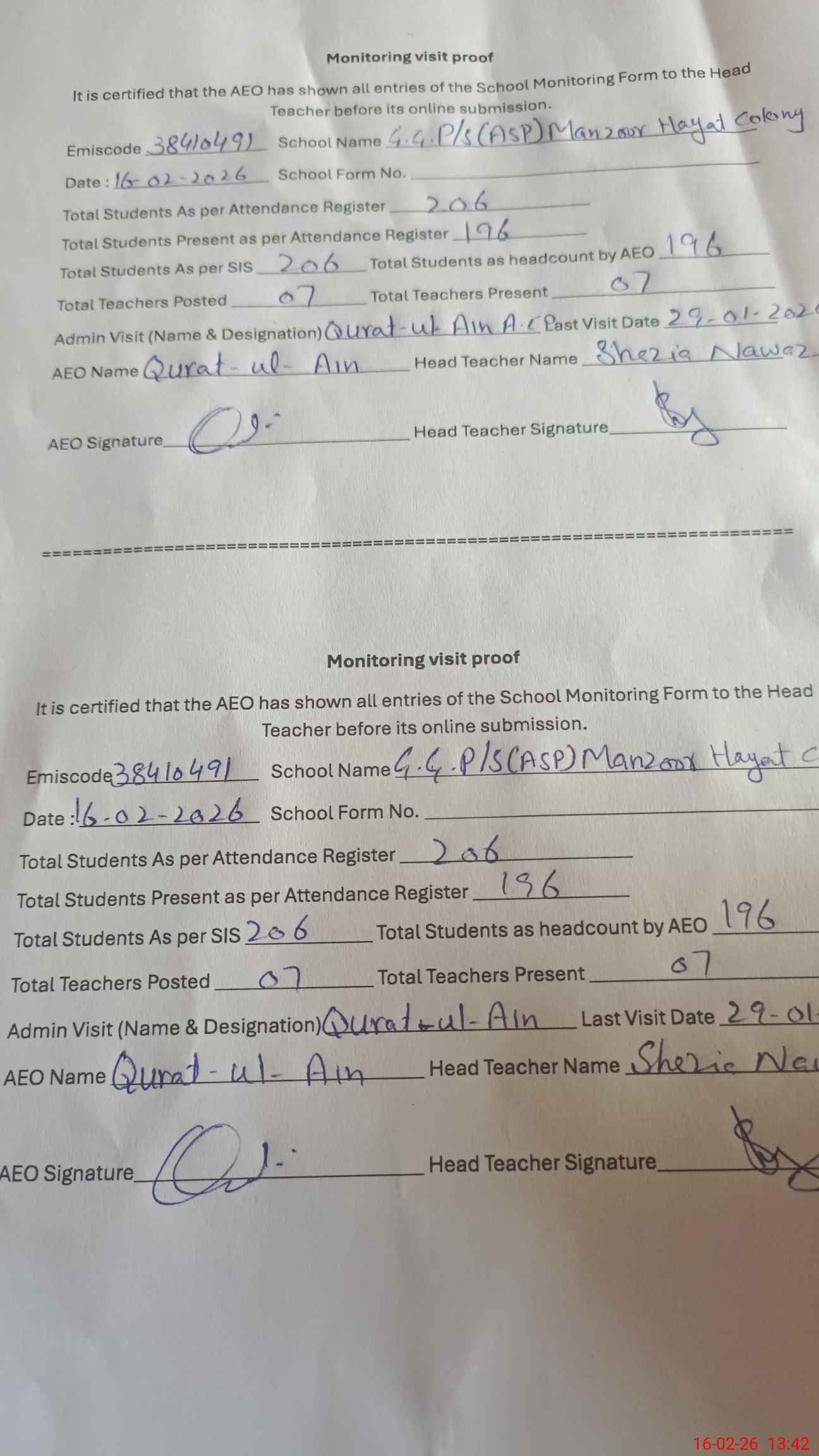 | Attendance Register | Head Teacher | MEA with School | Visit Proof |