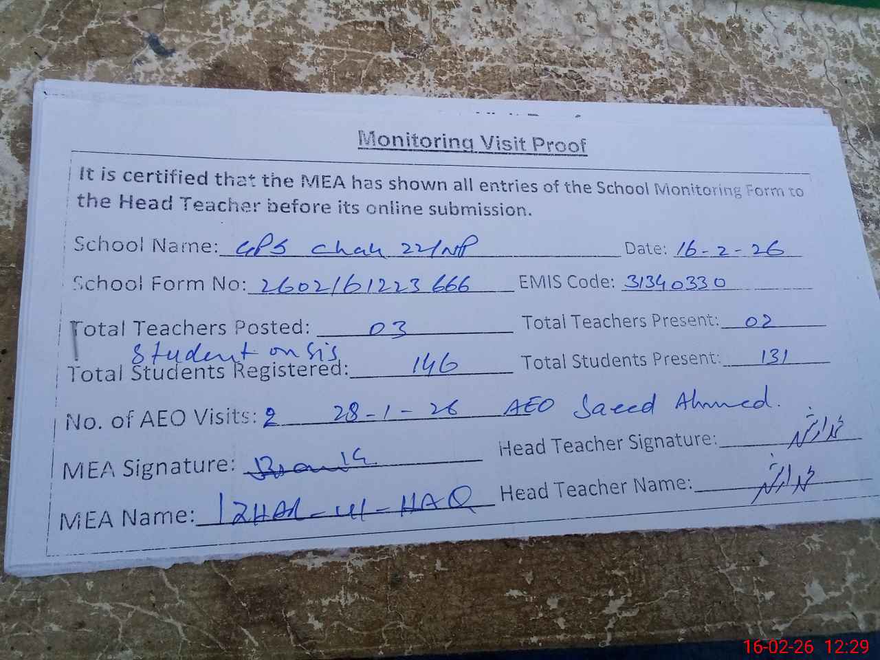 | EMIS Code: 31340330 | Name of School: GPS CHAK NO 22/NP | |||