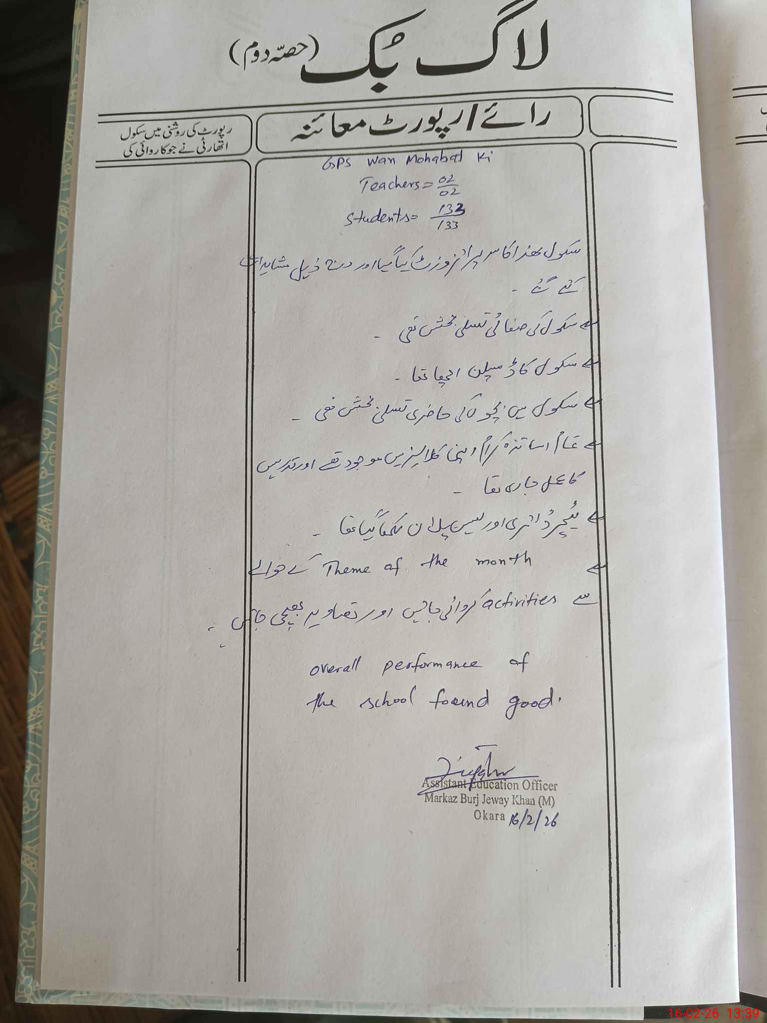 | Certified that this School was Inspected by the Undersigned MEA/DMO Today and the Information Stated Above is as Per Record. | |||||