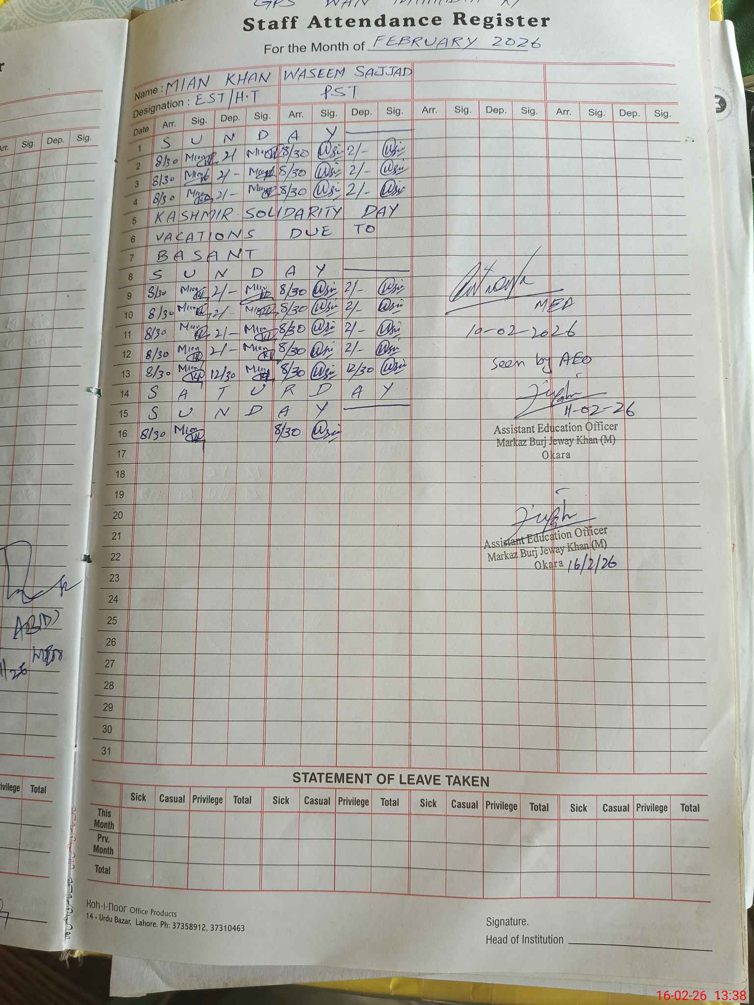 | Name: MI**** KH**** Designation: (School Headmaster's/Headmistress's) PTC/JV Phone/Cell Number: 03**** |
