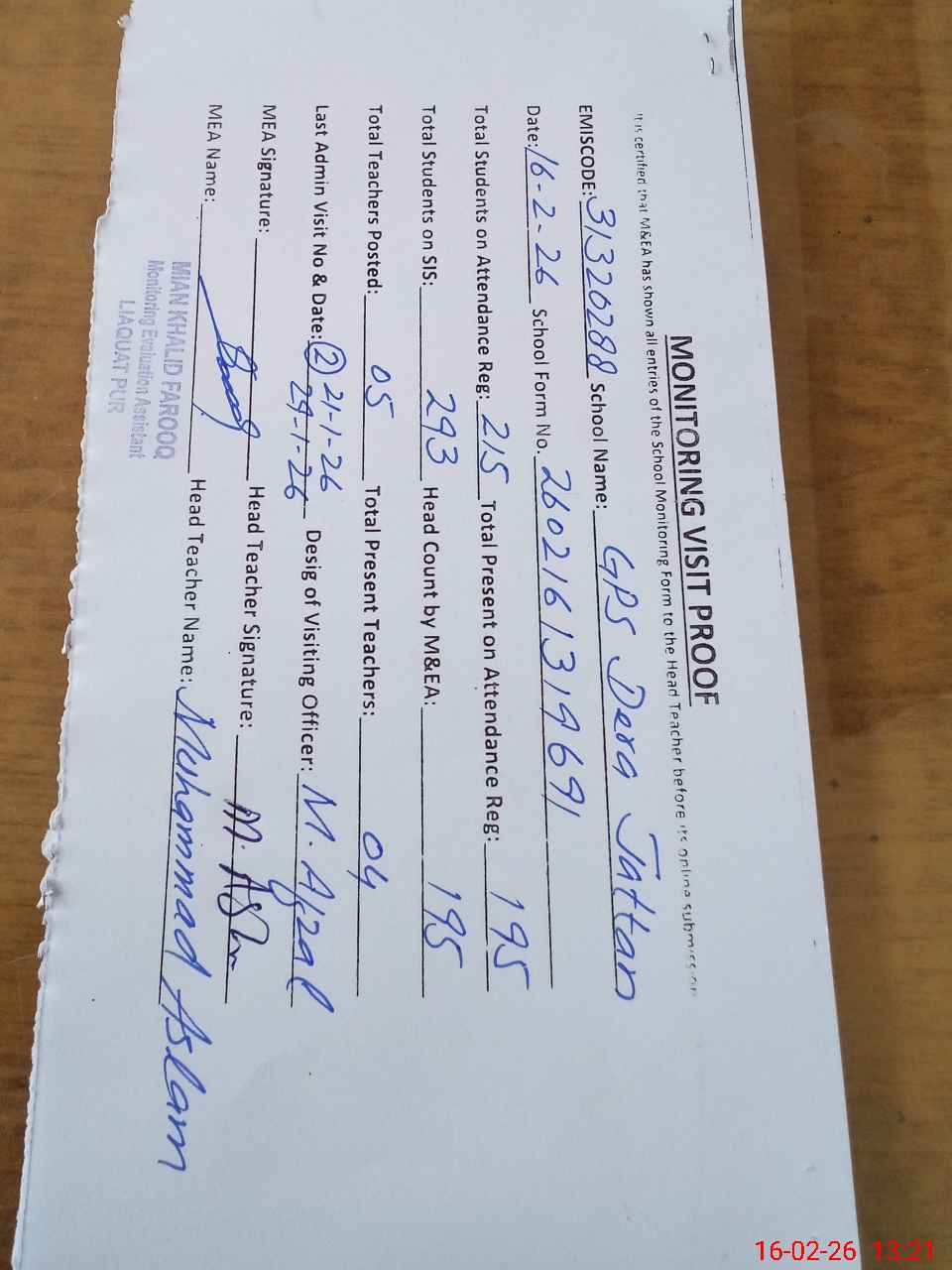 | Attendance Register | Head Teacher | MEA with School | Visit Proof |