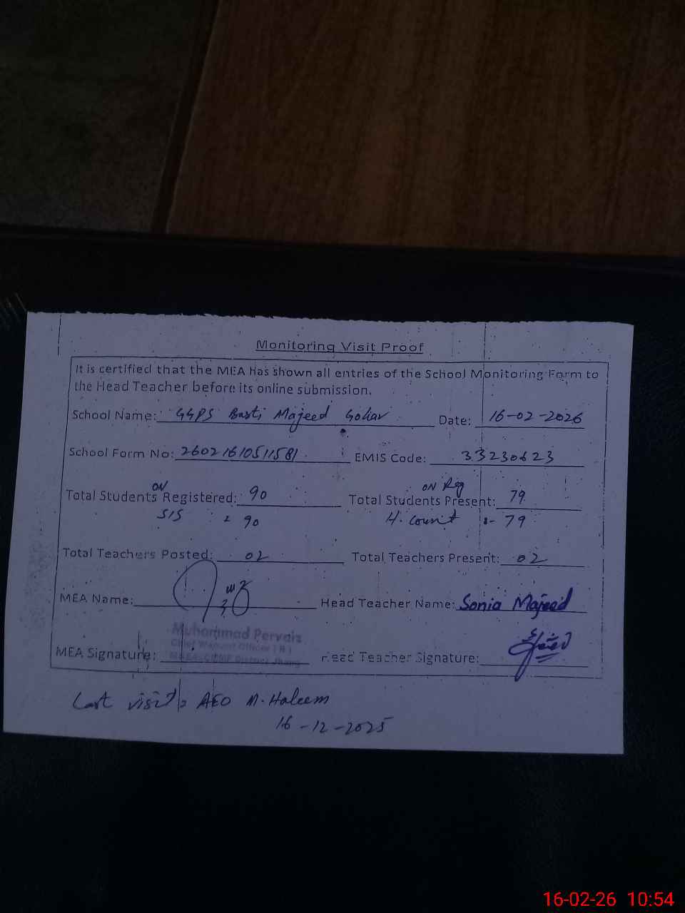 | Attendance Register | Head Teacher | MEA with School | Visit Proof |