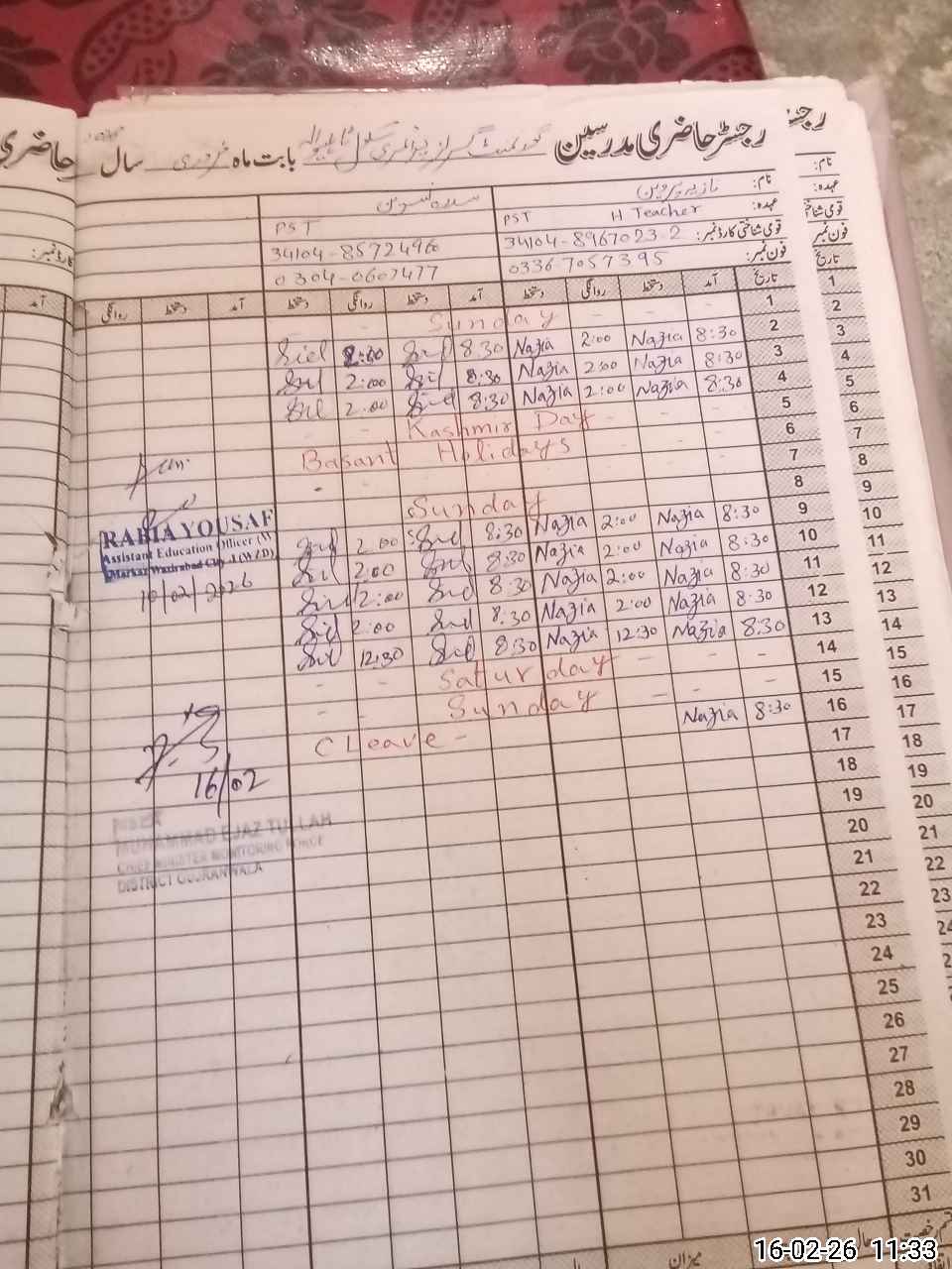 | Name: NA**** PE**** Designation: (School Headmaster's/Headmistress's) PST/PTC/JV Phone/Cell Number: 03**** |