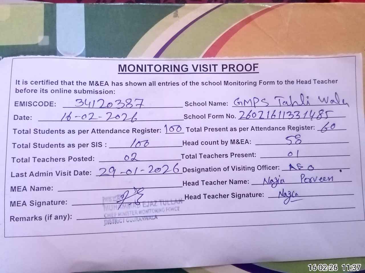 | Attendance Register | Head Teacher | MEA with School | Visit Proof |