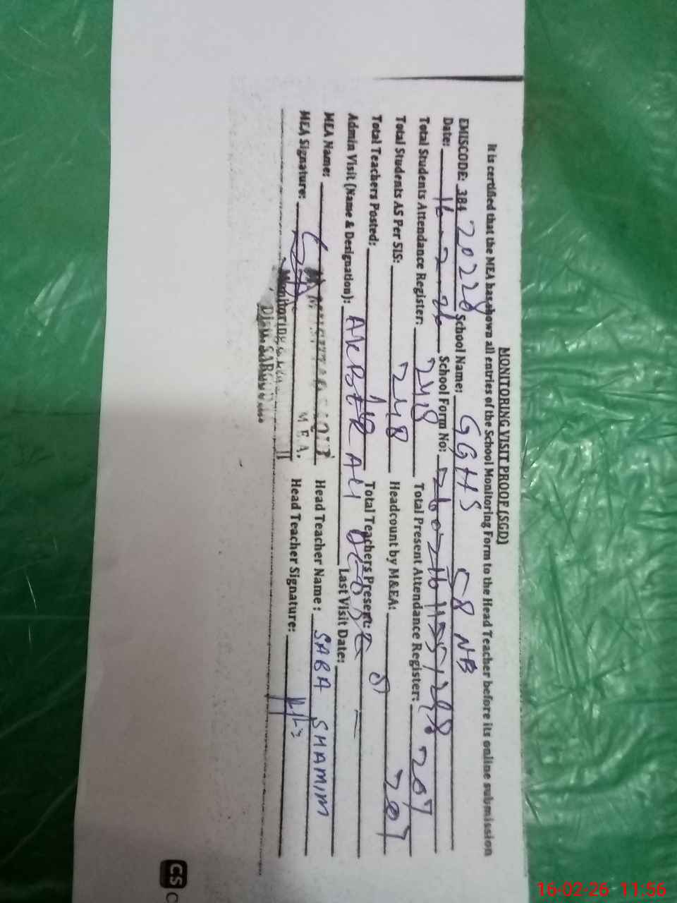 | Attendance Register | Head Teacher | MEA with School | Visit Proof |