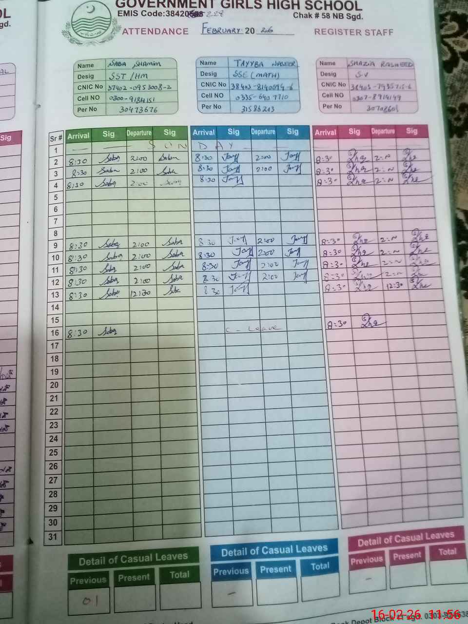 | CNIC | Full Name | Designation | R/C | Absence during last cal. month |