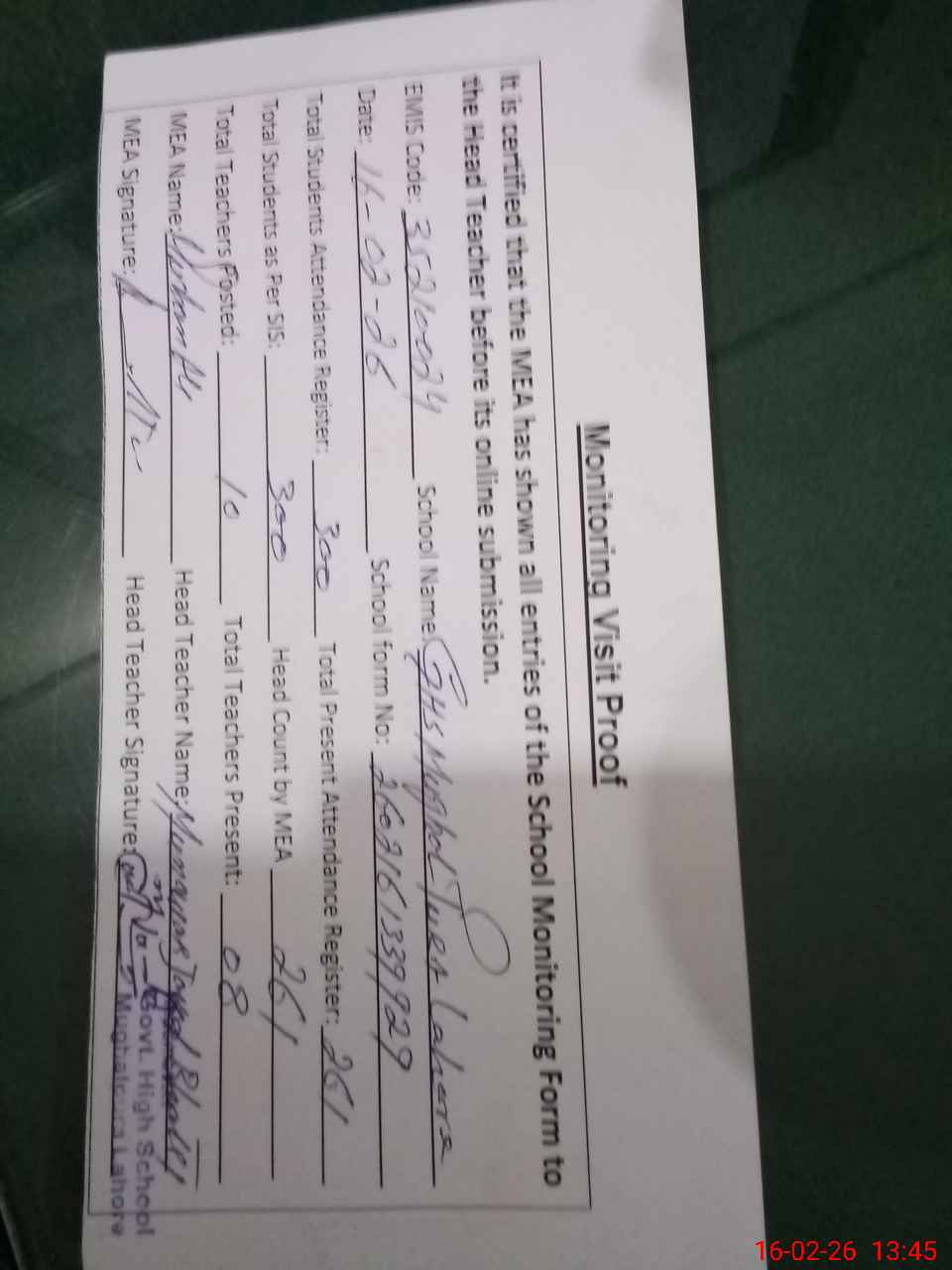 | Attendance Register | Head Teacher | MEA with School | Visit Proof |