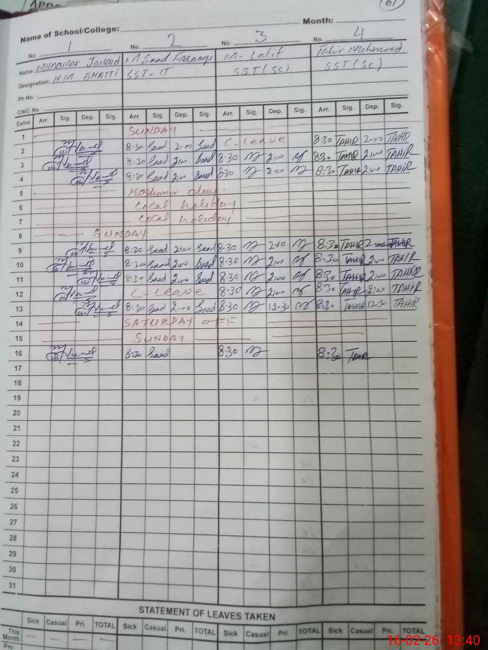 | CNIC | Full Name | Designation | R/C | Absence During Last Calender Month |