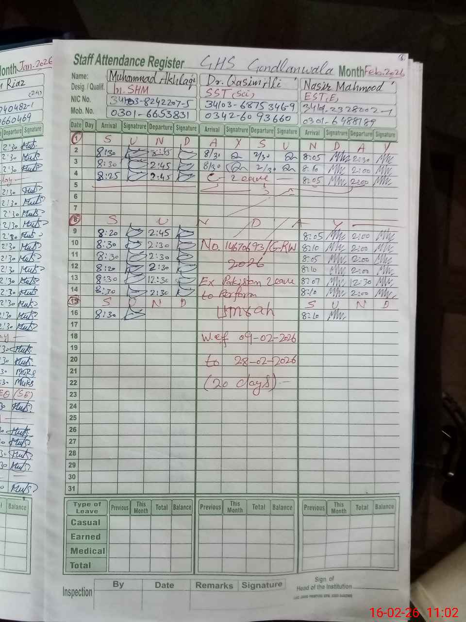 | CNIC | Full Name | Designation | R/C | Absence During Last Calender Month |