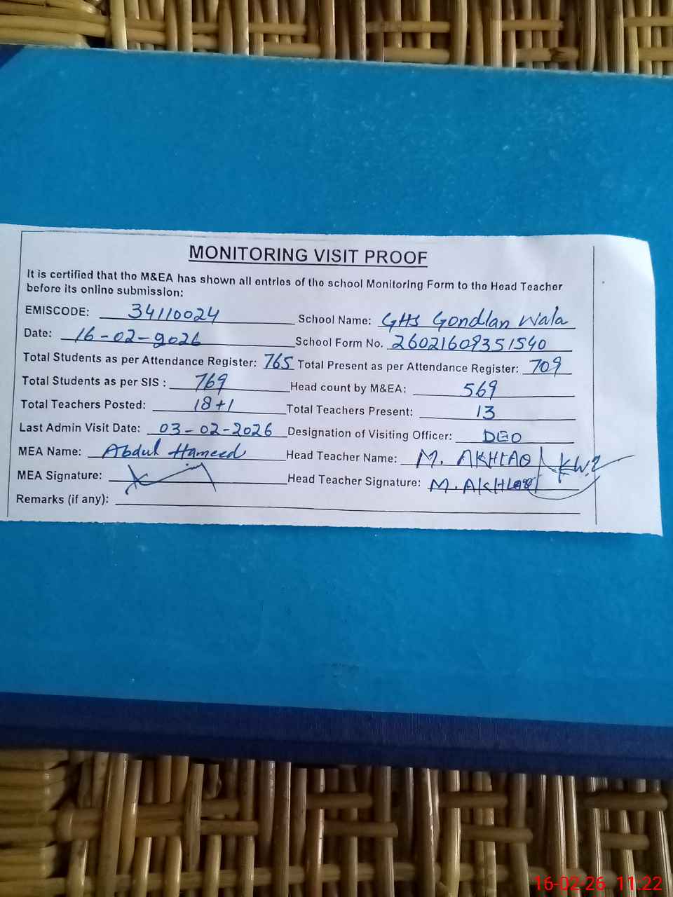| Remarks (Use Separate Page if Required): fake students present attendance mark in class 6th and 7th NSB register uncompleted from last December 2025 unauthorized Care giver teaching ECE and nursery class 4 teachers are absent from duty but Mark present in attendance register | |||||