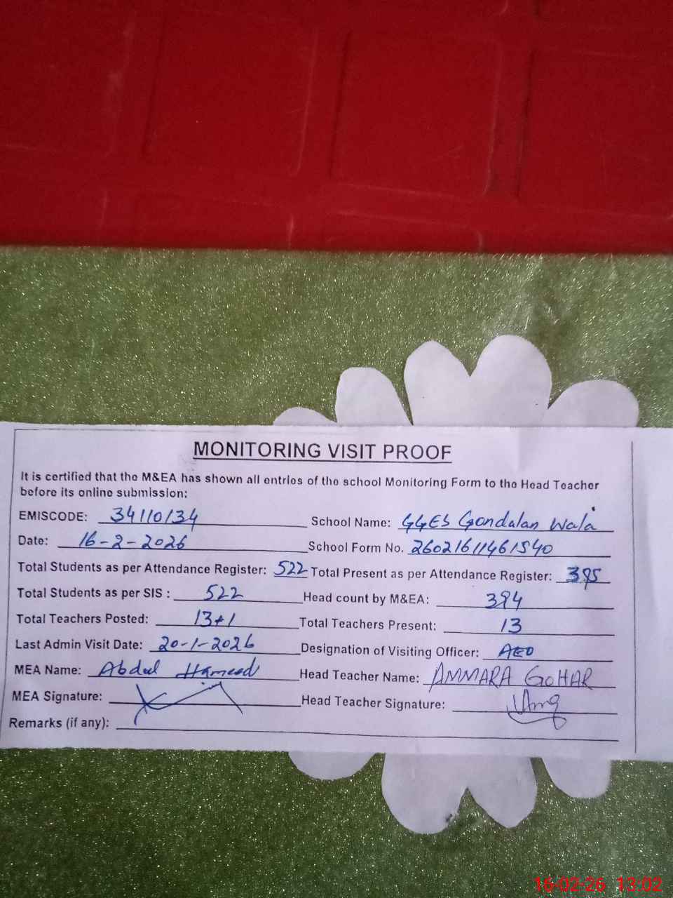 | EMIS Code: 34110134 | Name of School: GGES GONDALAN WALA | |||