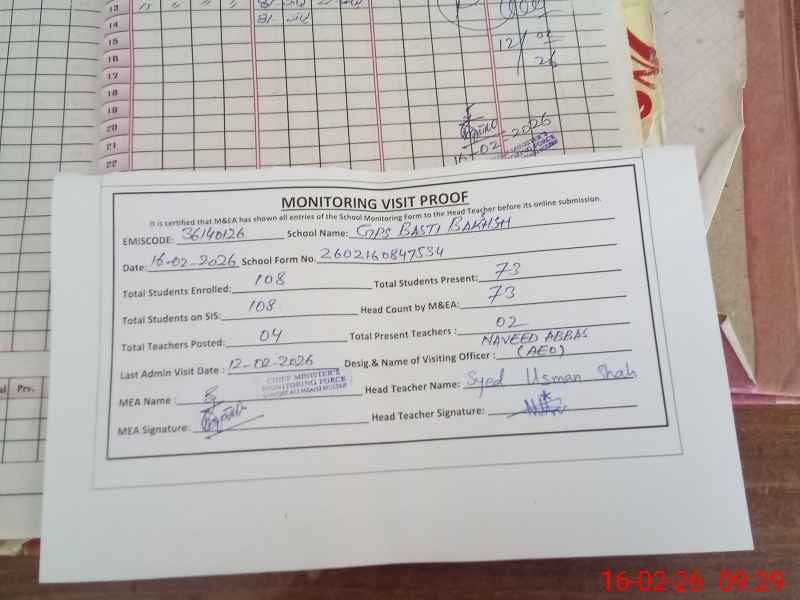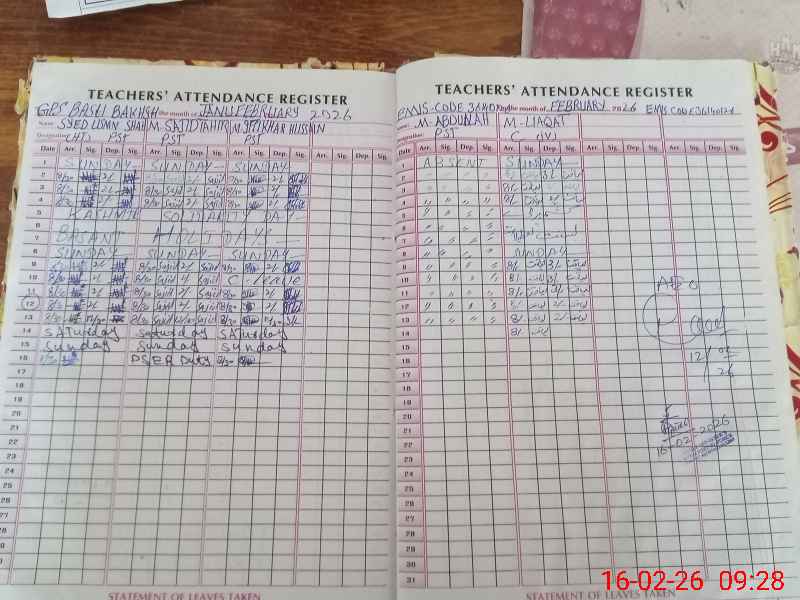 | Total no. of Classrooms: 2 No. of Classrooms Used for Teaching: 2 No. of Classrooms Storing Old Furniture, FTBs, etc: 0Comments if Any: PST MUHAMMAD ABDULLAH IS ABSENT FROM 14 MARCH 2025 STILL ABSENT |