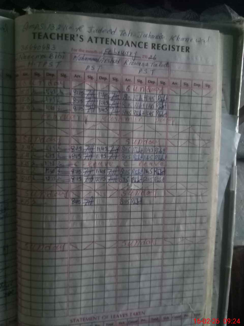 | CNIC | Full Name | Designation | R/C | Absence During Last Calender Month |