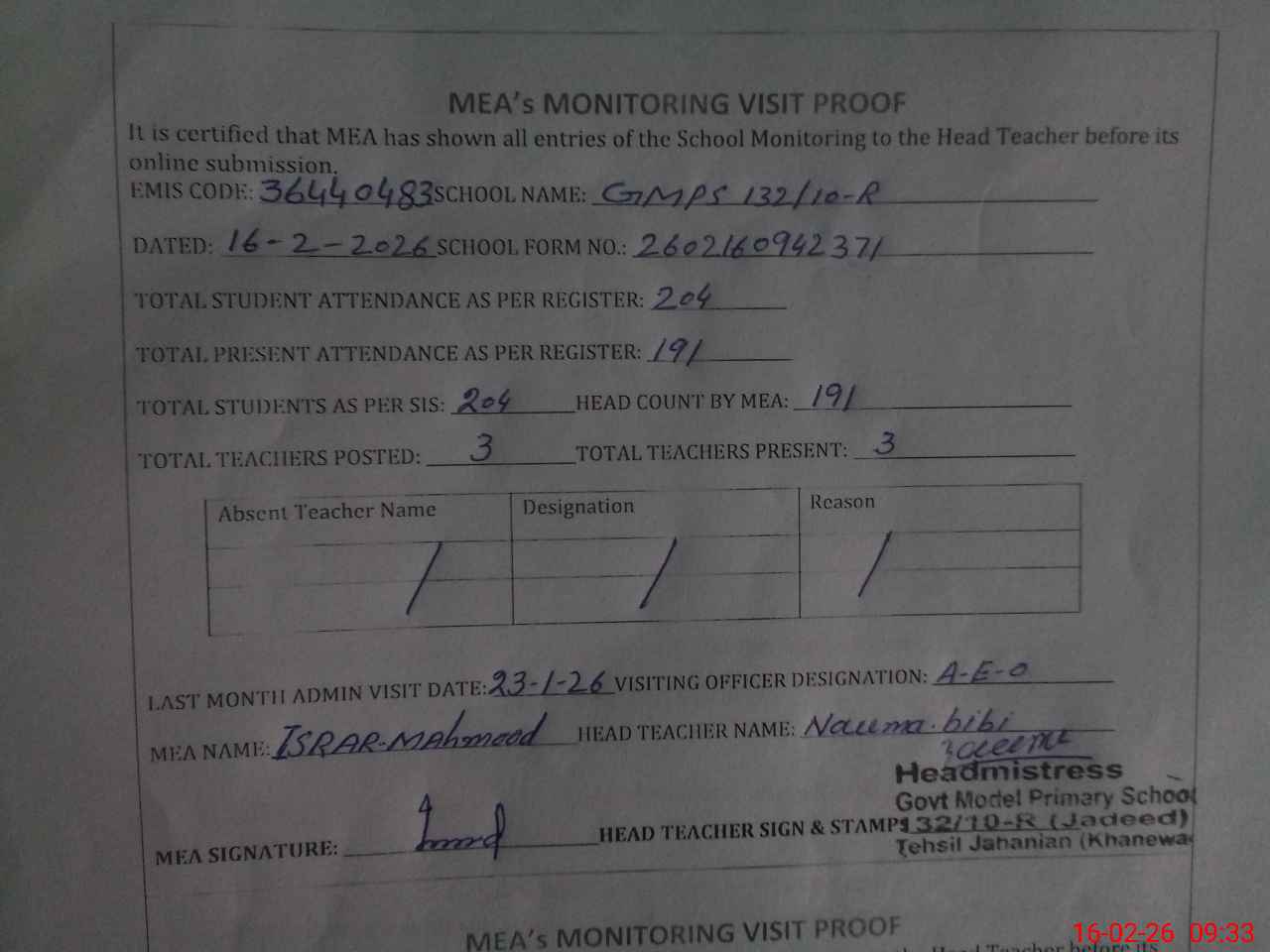 | Attendance Register | Head Teacher | MEA with School | Visit Proof |