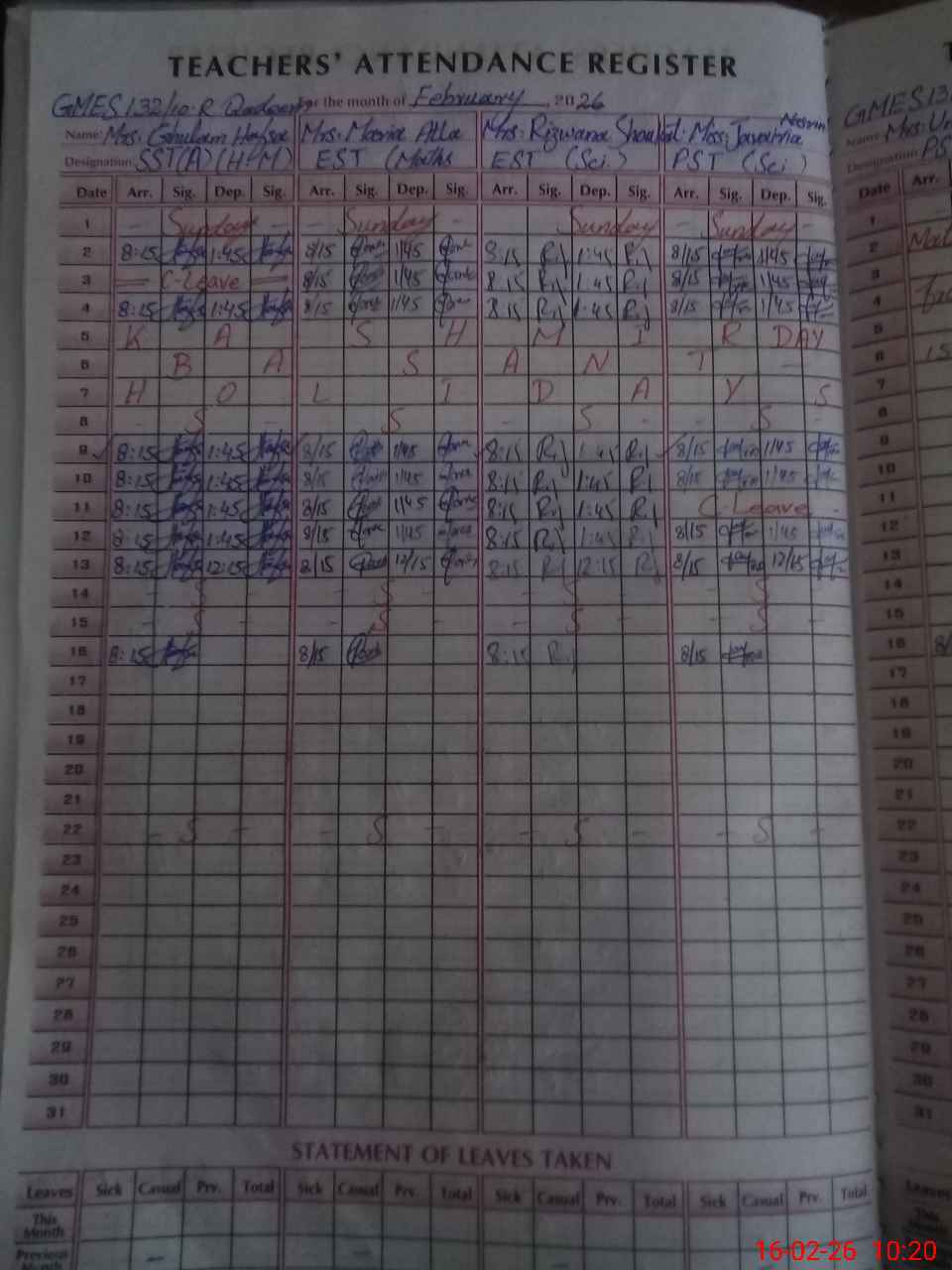 | Leave | Duty | Absent | Maternity | Medical | Ex- Pak |