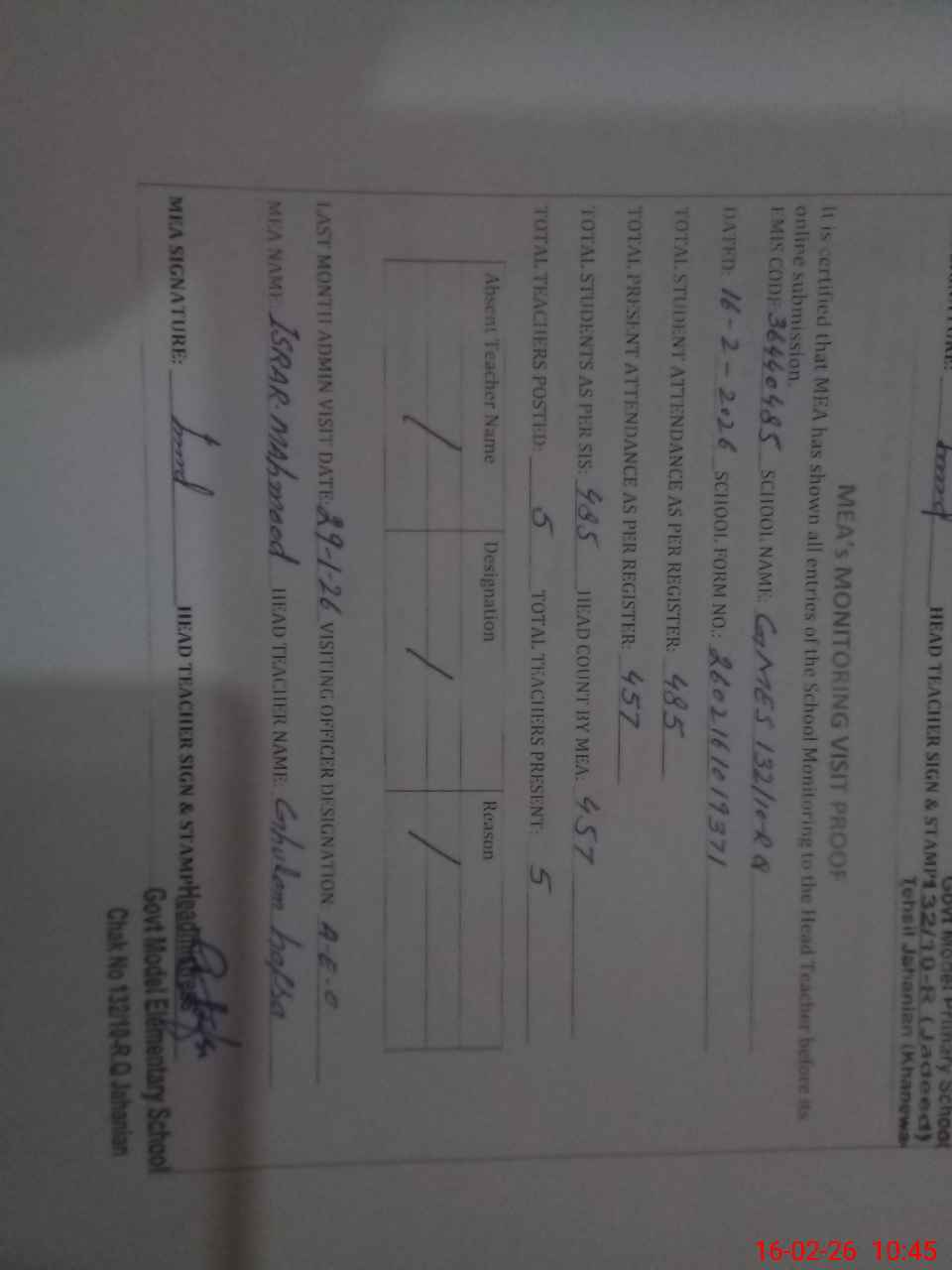 | Attendance Register | Head Teacher | MEA with School | Visit Proof |
