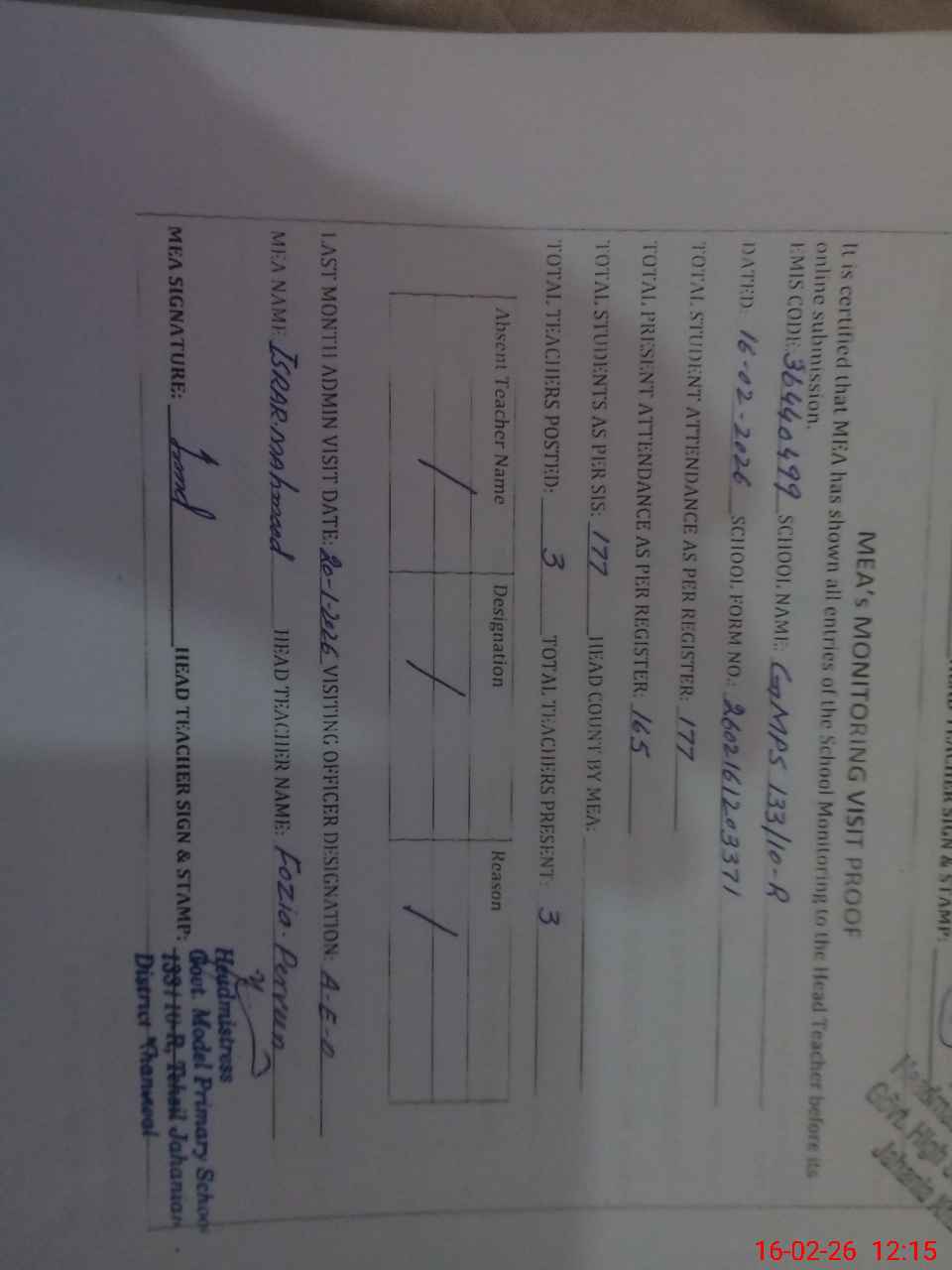 | Certified that this School was Inspected by the Undersigned MEA/DMO Today and the Information Stated Above is as Per Record. | |||||
