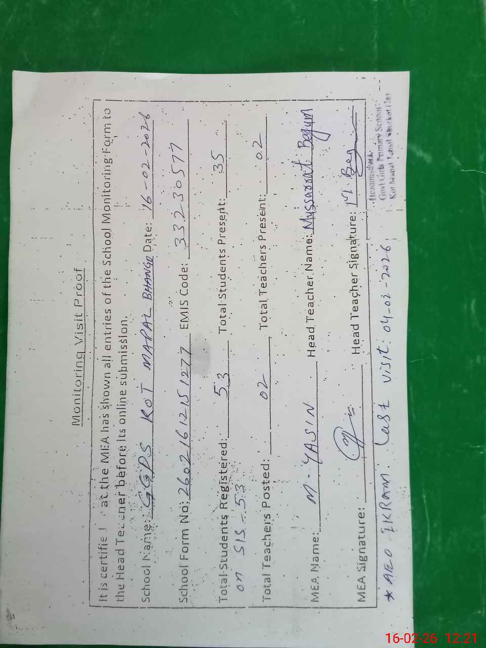 | Attendance Register | Head Teacher | MEA with School | Visit Proof |