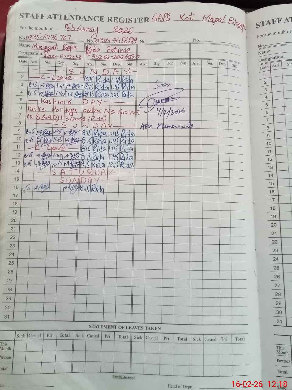 | Name: No**** An**** Designation: (School Headmaster's/Headmistress's) PST Phone/Cell Number: 03**** |