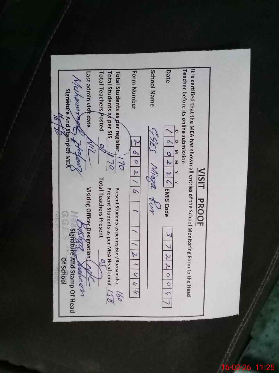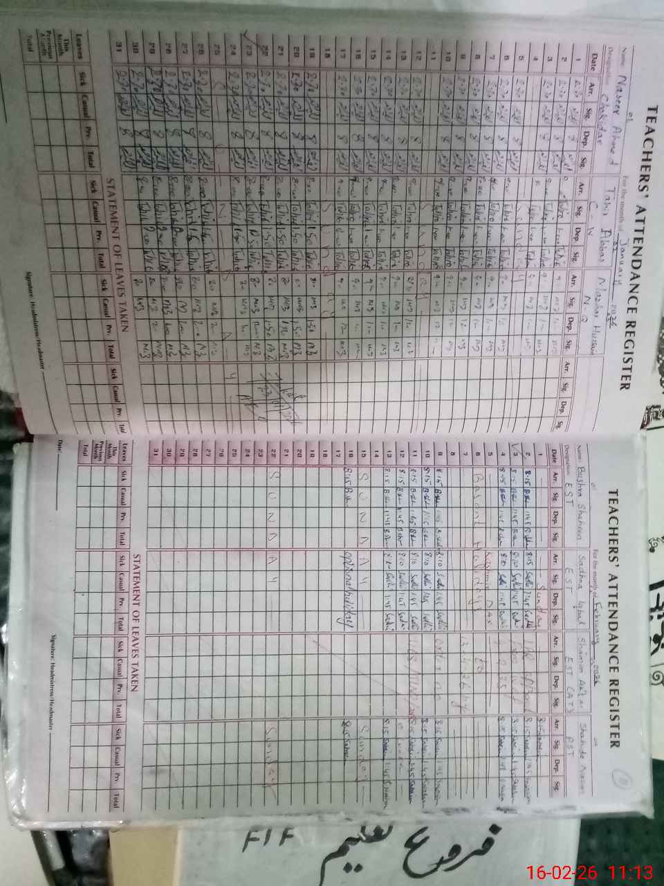| Total no. of Classrooms: 9 No. of Classrooms Used for Teaching: 9 No. of Classrooms Storing Old Furniture, FTBs, etc: 0Comments if Any: Sir EST Headmistress Bushra not prepared record of NSB and FTF. On her request I wait for 30 minutes and prepare the NSB and FTF. It is poor responsibility of her duty. Please check and instruct him. Other side contract not review/and contract renewal of |