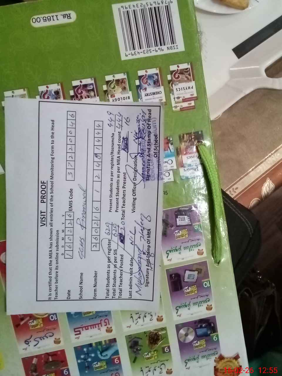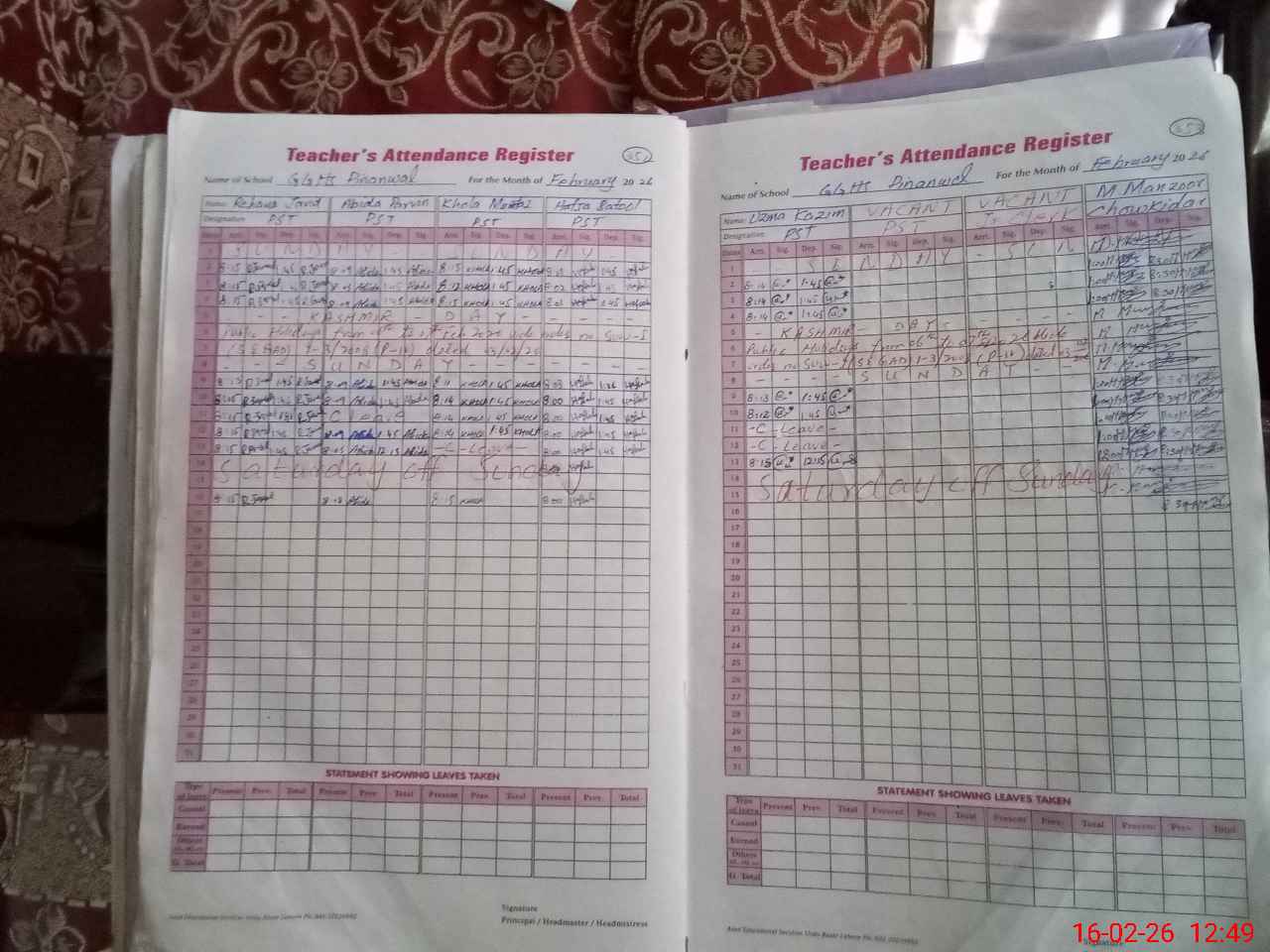 | Remarks (Use Separate Page if Required): Sir. Headmistress Sajid Bano was not present in school no order book . When I said seen foor order book Teacher SSE Rizwana Nasir tell lie about order book she said in locker and headmistress not give the key of locker she suddenly went leave and again this teacher said because of Sunday she not written order book after some time written a order on a paper from Headmistress and put the front of me . Picture available. *2* Leave, absent or present not mention on teacher attendance register of Teacher Uzma picture available. Incharg acting Headmistress Sameena kousar no knowledge about any thing about visit data. | |||||