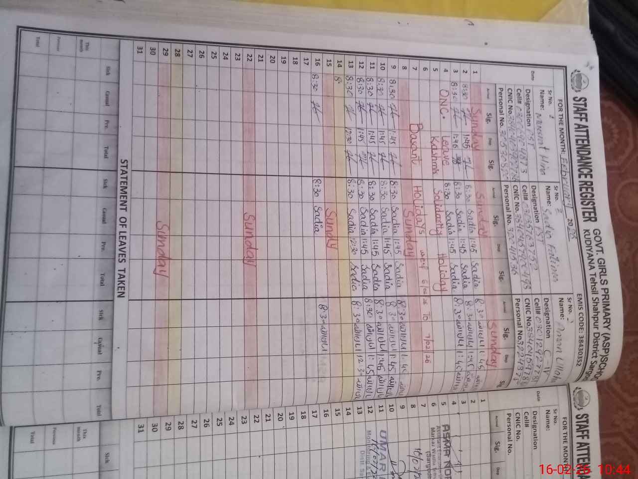| CNIC | Full Name | Designation | R/C | Absence During Last Calender Month |