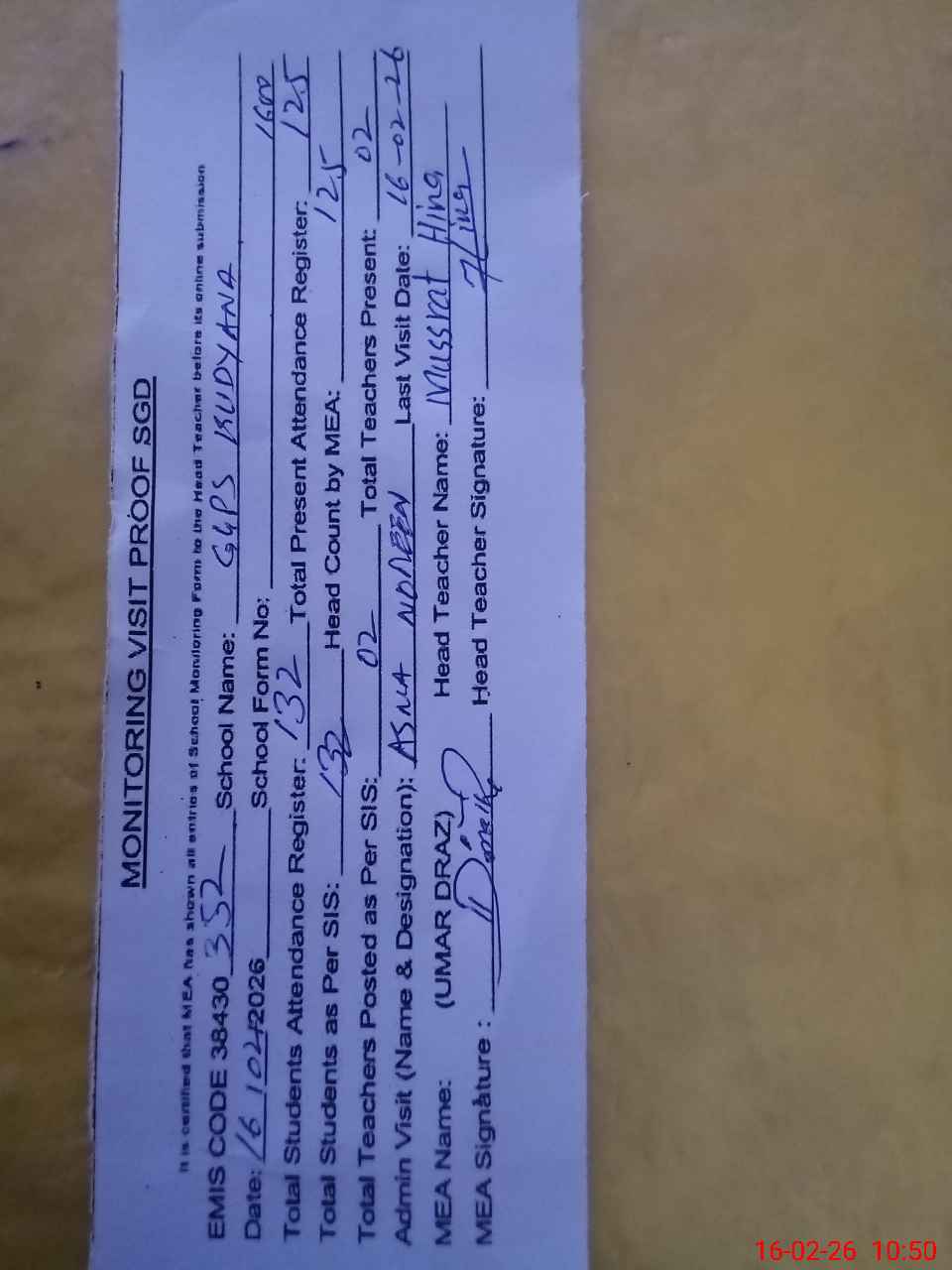 | Attendance Register | Head Teacher | MEA with School | Visit Proof |