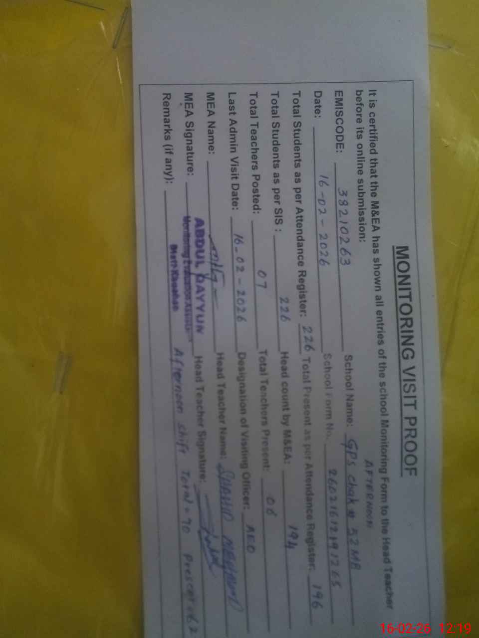 | Attendance Register | Head Teacher | MEA with School | Visit Proof |