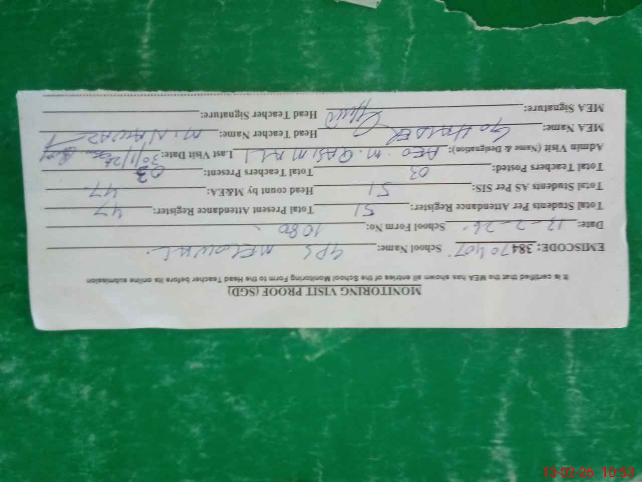 | Certified that this School was Inspected by the Undersigned MEA/DMO Today and the Information Stated Above is as Per Record. | |||||