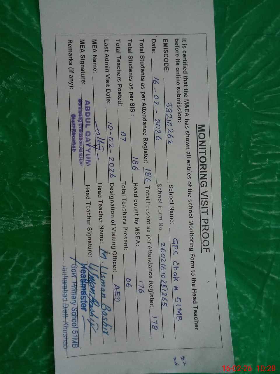 | EMIS Code: 38210262 | Name of School: GPS CHAK NO 51 MB | |||