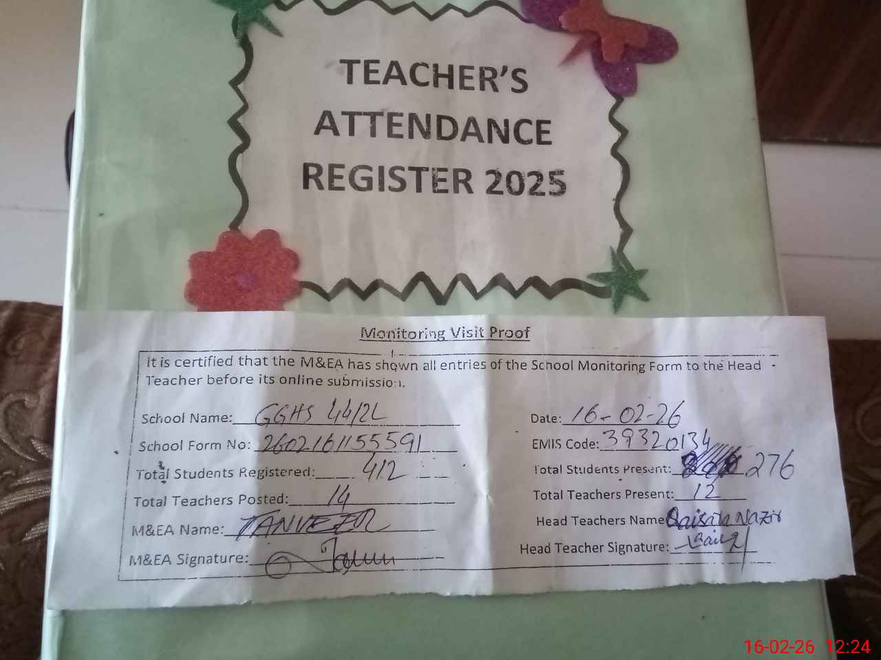| Attendance Register | Head Teacher | MEA with School | Visit Proof |