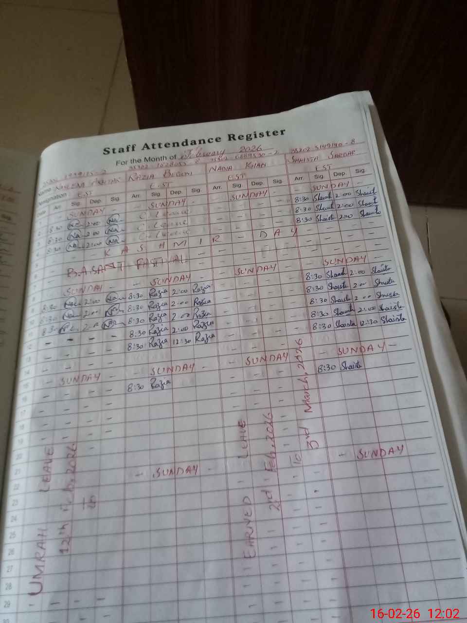 | CNIC | Full Name | Designation | R/C | Absence During Last Calender Month |