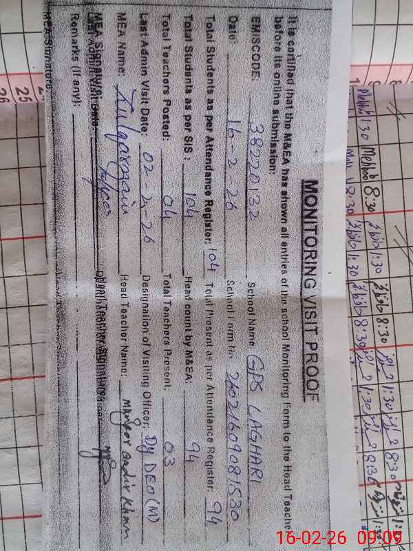 | Remarks (Use Separate Page if Required): Total student as per SIS 104 Total student as per Register 104 Total present as per Register 94 Head count by MEA 94 Boundary wall under construction | |||||