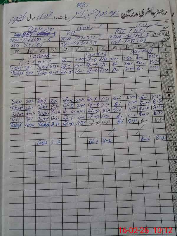 | CNIC | Full Name | Designation | R/C | Absence During Last Calender Month |