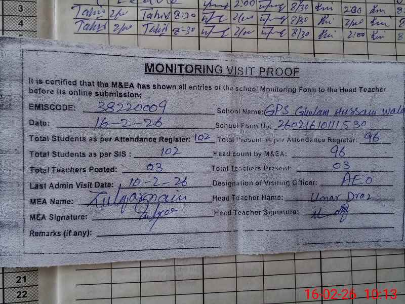 | EMIS Code: 38220009 | Name of School: GPS GHULAM HUSSAIN WALA | |||
