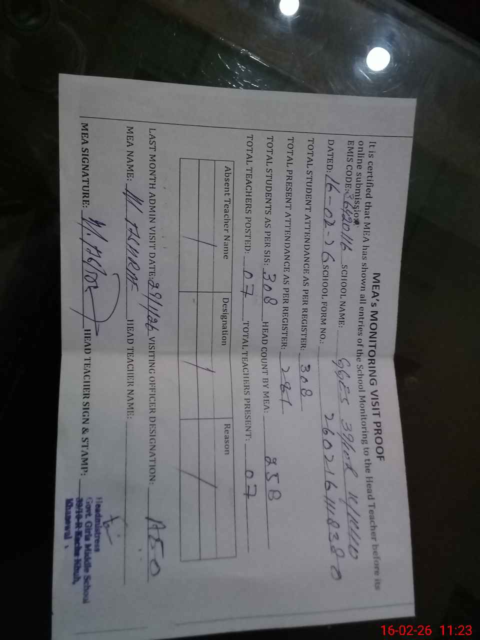 | Attendance Register | Head Teacher | MEA with School | Visit Proof |