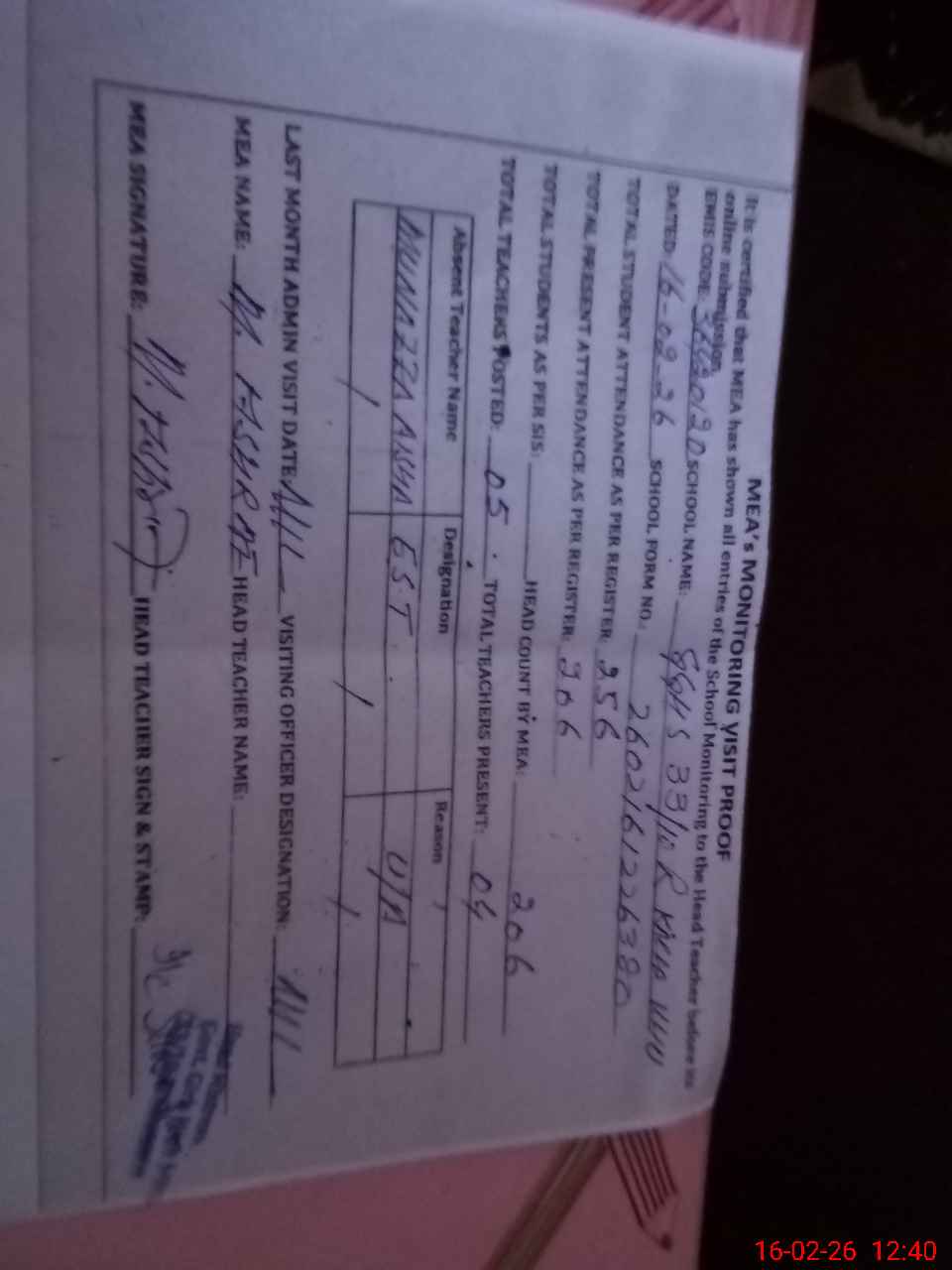 | Certified that this School was Inspected by the Undersigned MEA/DMO Today and the Information Stated Above is as Per Record. | |||||