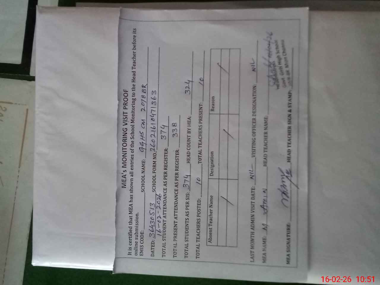 | Certified that this School was Inspected by the Undersigned MEA/DMO Today and the Information Stated Above is as Per Record. | |||||