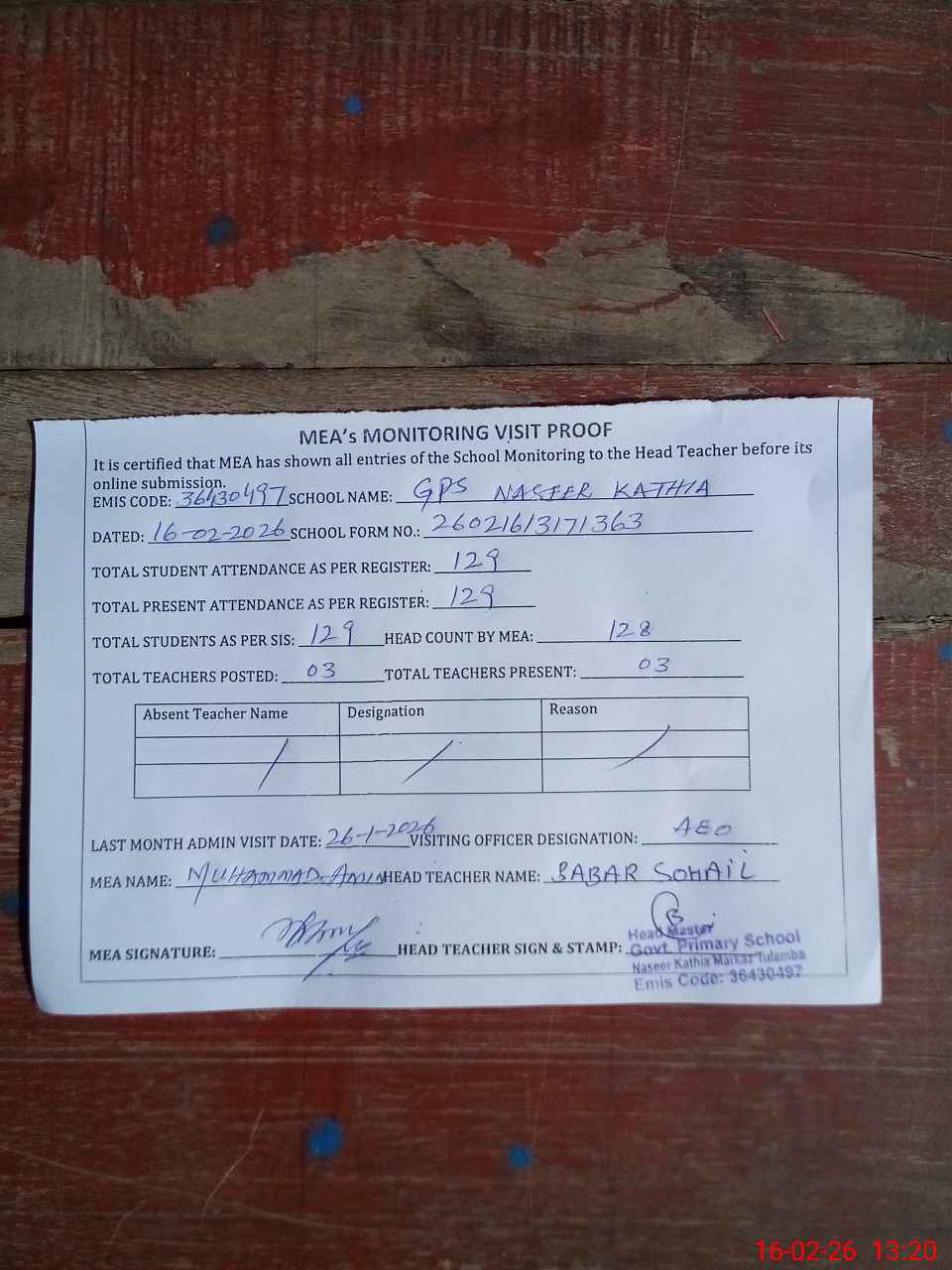 | Attendance Register | Head Teacher | MEA with School | Visit Proof |